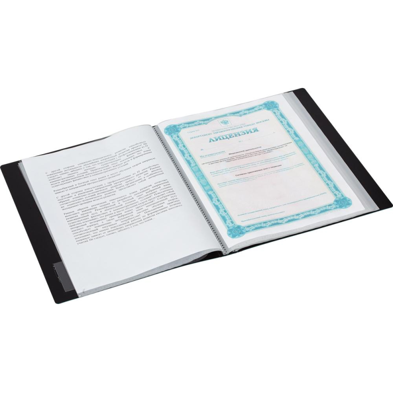 Папка с файлами Комус формата А4 изготовлена из полипропилена толщиной 0,8 мм двух цветов: голубого (внешняя поверхность) и черного (внутренняя поверхность). Имеет 40 несъемных прозрачных вкладышей для удобного хранения и демонстрации документов. В каждом из них можно разместить по два листа. Ширина корешка составляет 20 мм. Файловая папка дополнительно оснащена внутренним карманом для компакт-дисков и визитных карточек. Плотность файлов 30 мкм.