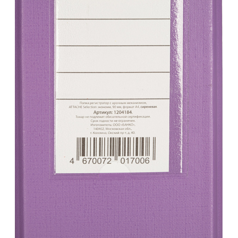 Папка-регистратор Attache Selection с арочным механизмом изготовлена из плотного картона, с внешней стороны обтянута бумвинилом сиреневого цвета. Корешок - бумажный. На корешке шириной 90 мм есть карман с этикеткой и кольцо для удобного захвата. Папка вмещает до 750 листов. Папки-регистраторы используются в офисах, учебных заведениях или дома для удобного хранения и организации большого количества документов. Они помогут сохранить порядок и обеспечат удобный доступ к нужной информации. Законодательные и технические документы
