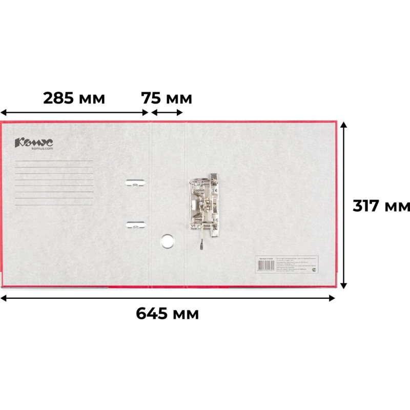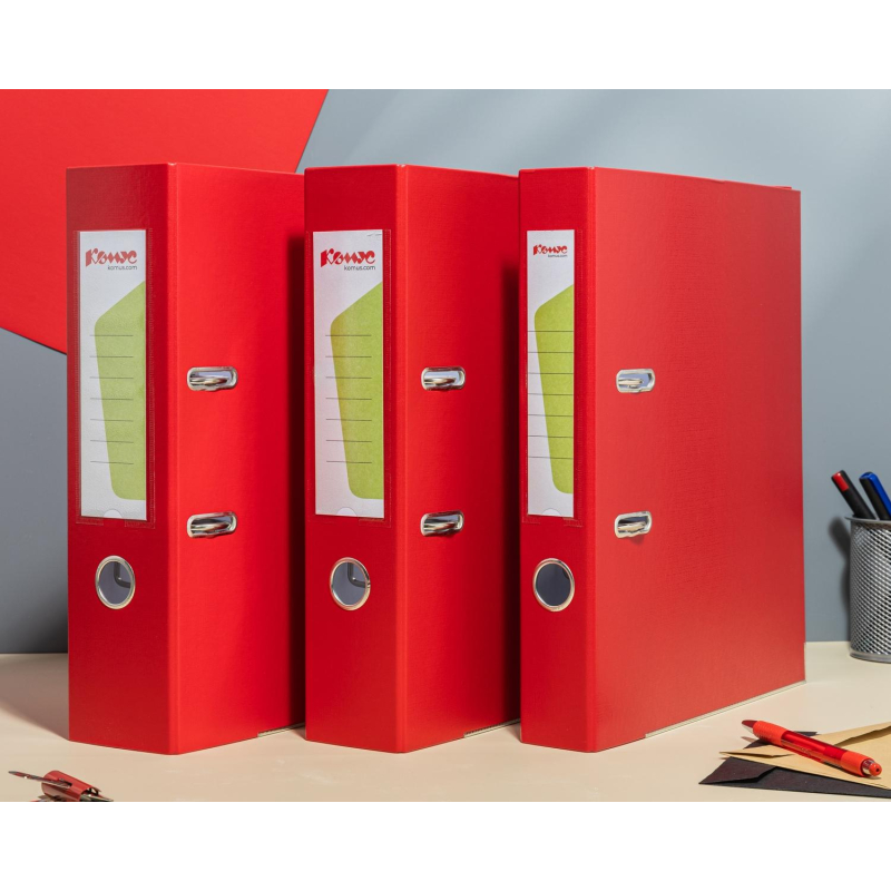 Папка-регистратор 'Комус' из коллекции 'Экономи' подходит для хранения большого количества документов. Формат А4. Изготовлена из плотного картона, покрытого бумвинилом красного цвета. Внутренняя вклейка бумажная, предусмотрено место для записей. Папка вмещает до 480 листов. Арочный механизм произведен в Чехии. Нижние края папки защищены от повреждений металлическим кантом. На корешке шириной 75 мм есть карман со сменной этикеткой и кольцо для захвата. Благодаря прорезям для колец на внешней крышке папка-регистратор 'Комус' остается закрытой даже при большом количестве бумаг. Размер кармана на корешке папки может быть разным и зависит от производителя папок. Цвет папки может быть насыщенным или более светлым в зависимости от производителя папок. Высота папки может отличаться в зависимости от производителя. Размеры могут быть 317х285х75 мм или 320х285х75 мм. Законодательные и технические документы