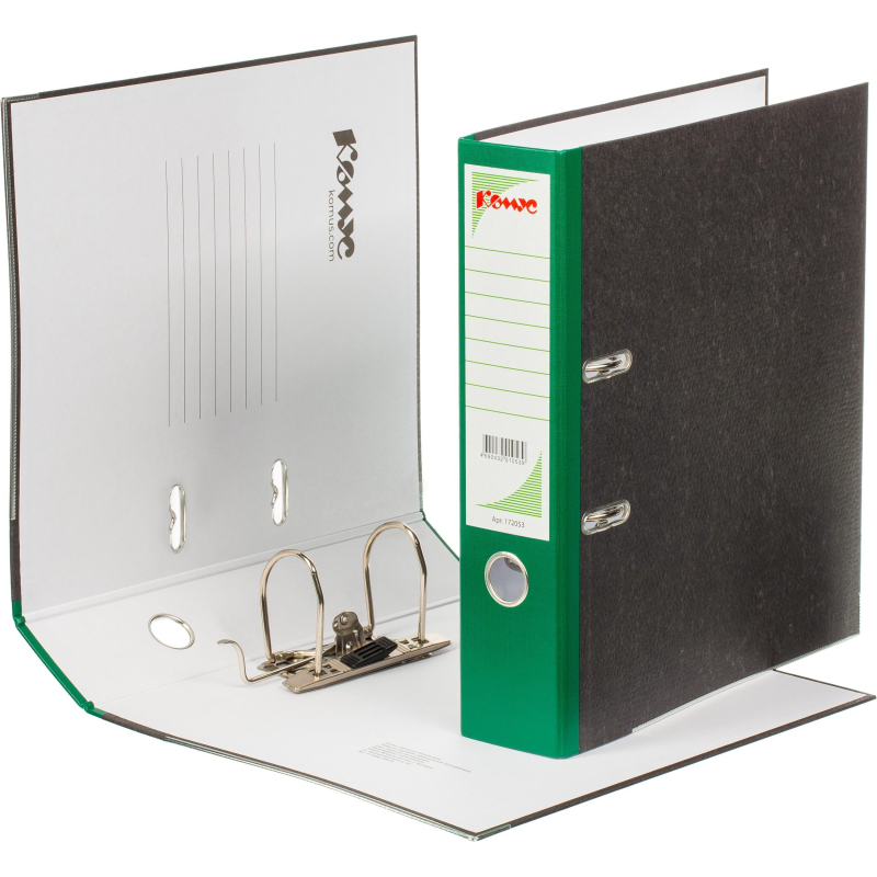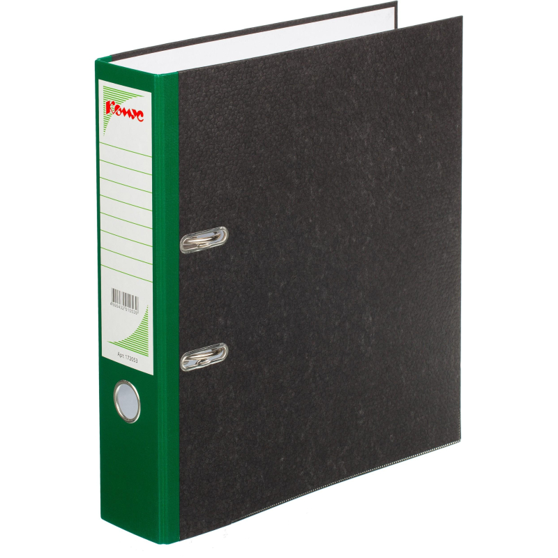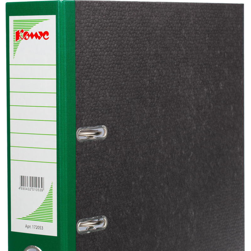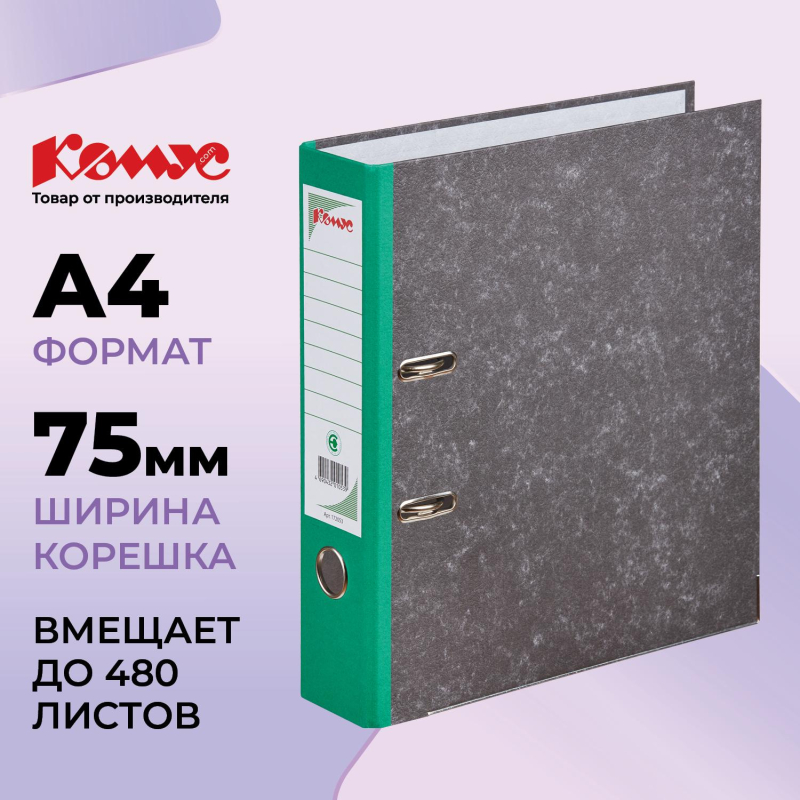 Папка-регистратор 'Комус' с арочным механизмом формата А4 изготовлена из плотного картона, покрытого фактурной бумагой под мрамор, произведенной в Великобритании. Нижние края защищены металлическим кантом. Корешок зеленого цвета, ширина - 75 мм. Специальные прорези на крышке не дают папке открываться при большом количестве вложенных документов. На корешок наклеена этикетка, есть кольцо для удобного захвата. Арочный механизм произведен в Чехии. Папка-регистратор 'Комус' вмещает до 480 листов стандартной плотности. Папка-регистратор незаменима в офисах, государственных учреждениях и дома. Она обеспечит порядок и удобный доступ к необходимым документам. Законодательные и технические документы