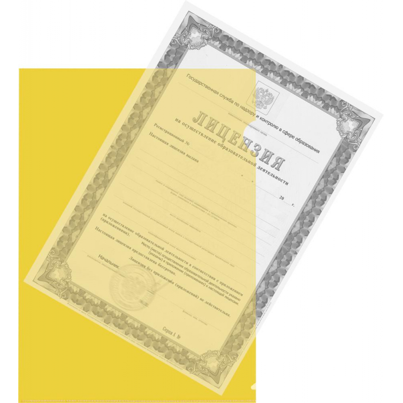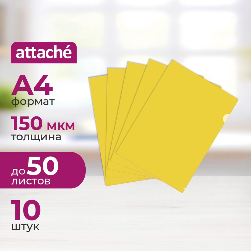 Папка-уголок формата А4 изготовлена из желтого пластика толщиной 150 мкм, 10 штук в упаковке. Позволяет удобно хранить и переносить документы, предотвращает их смятие и загрязнение. Вмещает до 50 листов стандартной плотности.
