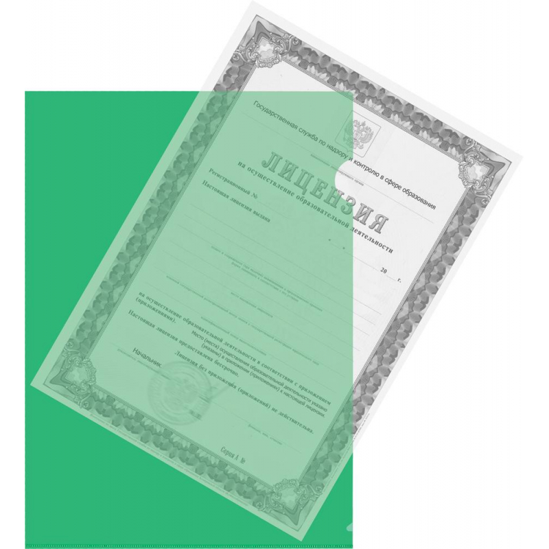 Папка-уголок формата А4 изготовлена из зеленого пластика толщиной 150 мкм, 10 штук в упаковке. Позволяет удобно хранить и переносить документы, предотвращает их смятие и загрязнение. Вмещает до 50 листов стандартной плотности.