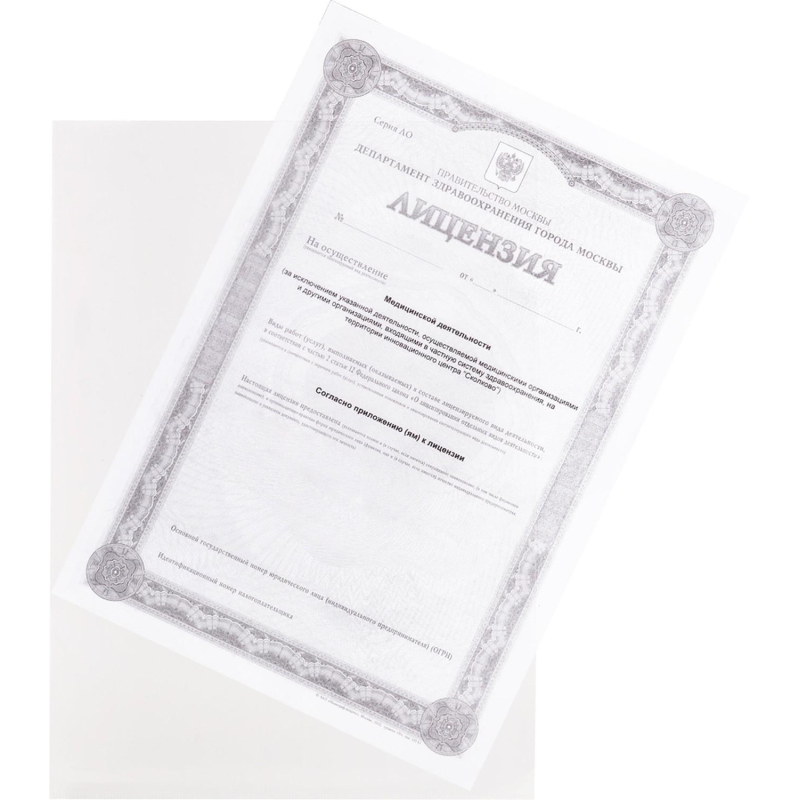 Папка-уголок формата А4 изготовлена из прозрачного полипропилена плотностью 120 мкм, прозрачного цвета, 20 штук в упаковке. Документы не мнутся и не пачкаются. Есть вырез для удобного извлечения листов. Папка вмещает до 40 листов стандартной плотности. Товар относится к ценовому сегменту «суперэконом». Имеет упрощенные характеристики и более простую упаковку. Отвечает основным требованиям потребления.
