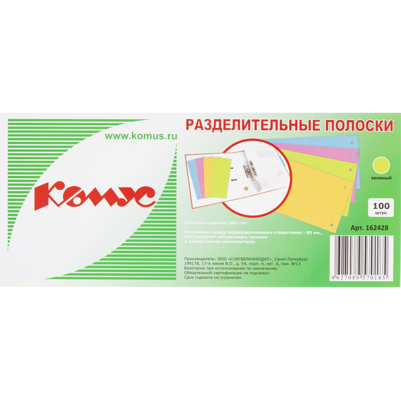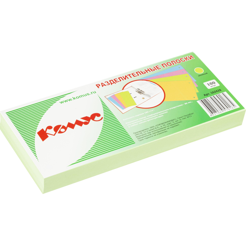 Разделители листов (полоски) "Комус" размером 10,5х24 см выполнены из картона плотностью 180 г/кв.м зеленого цвета. Позволяют делать пометки, систематизировать документы для быстрого поиска. Благодаря двум перфорациям разделители могут подшиваться в папки с кольцевыми и арочными механизмами. В упаковке 100 разделительных полосок. В рамках ребрендинга производится перевод дизайна данного артикула с сохранением всех потребительских характеристик товара. На переходный период допускается поставка данной продукции в двух вариантах дизайна.