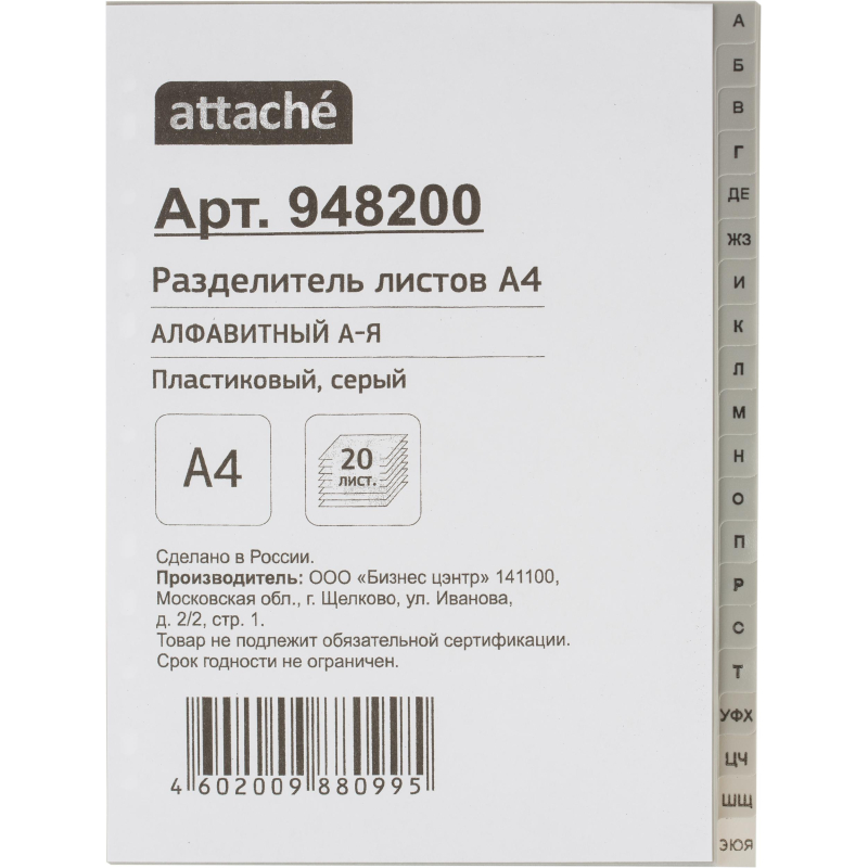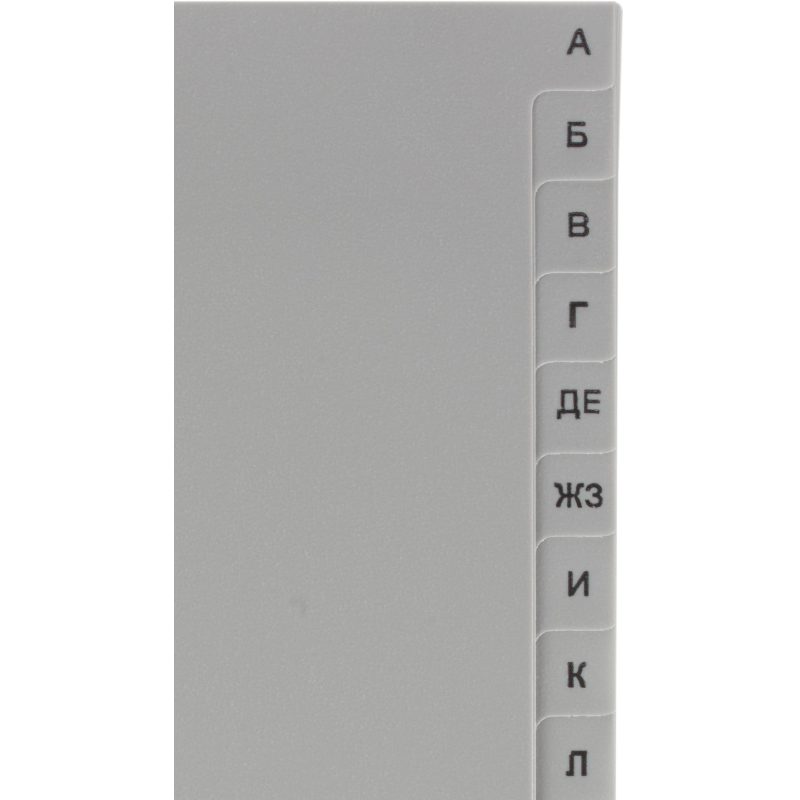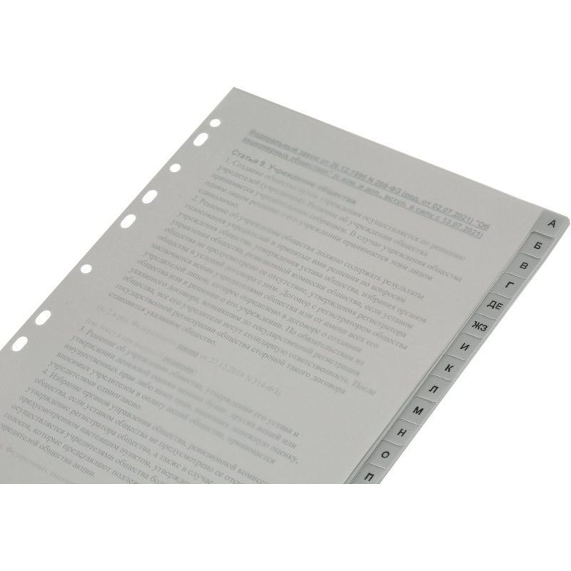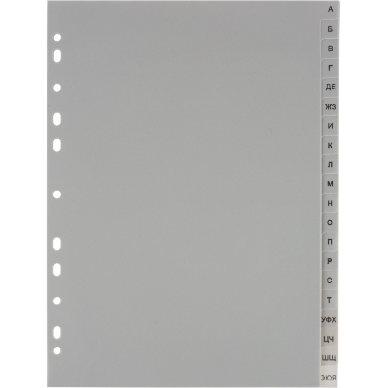 Разделители листов формата А4 изготовлены из пластика серого цвета. Размер - 297x224 мм. Предназначены для учета и систематизации документов в архивных папках, облегчают поиск нужных позиций. Толщина пластика составляет 120 мкм. Универсальная боковая перфорация совместима с различными механизмами подшивания. Разделители листов, состоящие из 20 разделов, содержат буквенную маркировку.