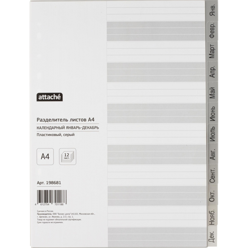 Разделители - это отличный вариант для систематизации документов внутри папок разного вида. Они помогают сортировать информацию в том виде, как нужно именно Вам. Разделители листов Attache формата А4 серого цвета, облегчающие систематизацию архивных и текущих документов. Выполнены из прочного пластика толщиной 120 мкм. Имеют универсальную перфорацию для подшивки в папки. Разделители листов включают индекс по месяцам (12 разделов).