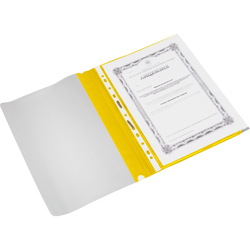 Скоросшиватель используется для хранения различного рода документации, для ведения документооборота, систематизации договоров, других важных бумаг. Папка изготовлена из мягкого пластика. Фактура - "апельсиновая корка". Толщина верхнего прозрачного листа - 130 мкм, нижнего цветного листа - 150 мкм. С прозрачной верхней обложкой. На лицевой стороне находится карман с белым бумажной полосой для указания содержания, вместимость - 100 листов стандартной плотности. Цвет - желтый