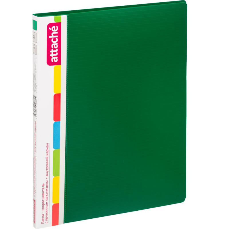 Скоросшиватель с пружинным механизмом Attache используется для хранения различного рода документации, для ведения документооборота, систематизации договоров, других важных бумаг. Формат А4. Папка изготовлена из пропилена толщиной 0,7 мм. Имеет прозрачный карман на левой внутренней обложке для документов. Ширина корешка - 16 мм, вместимость - 200 листов стандартной плотности. Цвет - зеленый. 1.положите скоросшиватель на горизонтальную поверхность, откройте его; 2.большим и указательным пальцами придайте пружинам вертикальное положение; 3.снимите планку со штырей движением вверх; 4.поместите перфорированные листы внутрь папки на штырьки-пружины; 5.поверх листов разместите ранее снятую планку, прижмите ее к бумаге; 6.с помощью большого и указательного пальцев разведите штырьки-пружины в противоположные направления.