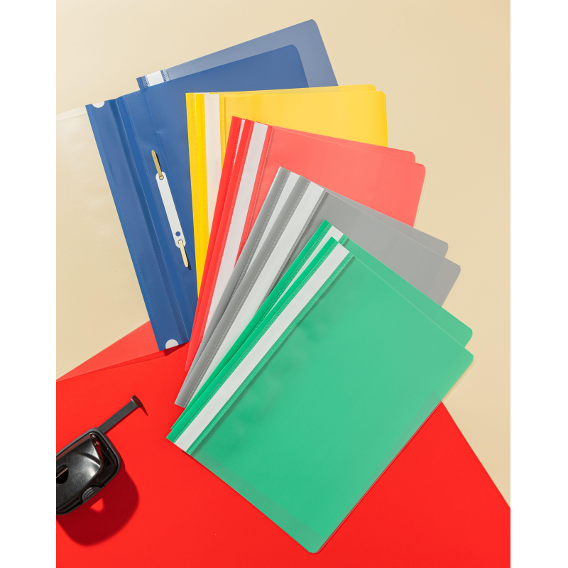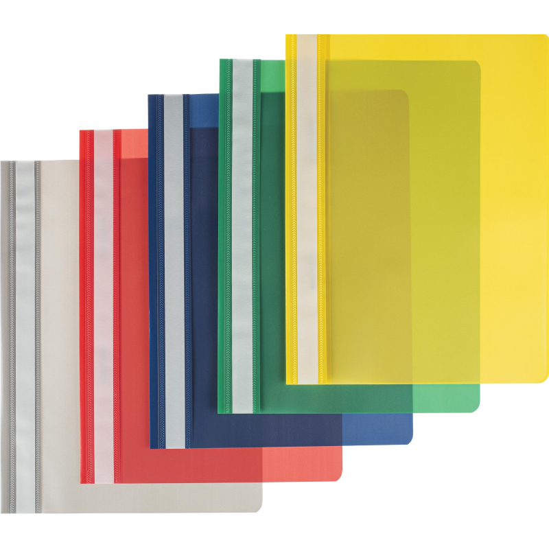 Скоросшиватель используется для хранения различного рода документации, для ведения документооборота, систематизации договоров, других важных бумаг. Форма А4. Папка изготовлена из мягкого пластика с фактурой "песок". Толщина пластика 140-150 мкм. С прозрачной верхней обложкой. Усиленный пластиковый корешок с белой полосой для размещения информации. Вместимость - 100 листов стандартной плотности. Цвет -ассорти (серый, красный, зеленый, желтрый, синий). 10 штук в упаковке (по 2 папки каждого цвета)