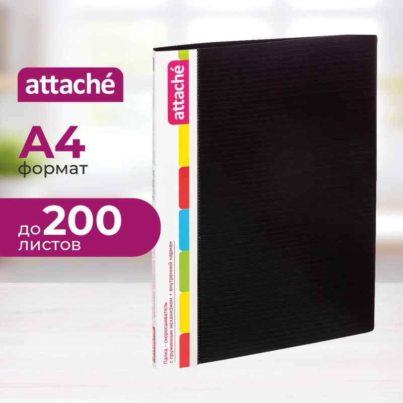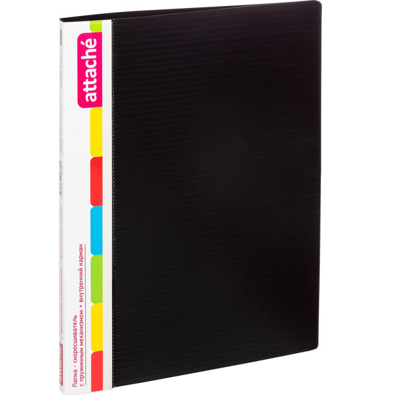 Скоросшиватель с пружинным механизмом Attache используется для хранения различного рода документации, для ведения документооборота, систематизации договоров, других важных бумаг. Формат А4. Папка изготовлена из пропилена толщиной 0,7 мм. Имеет прозрачный карман на левой внутренней обложке для документов. Ширина корешка - 16 мм, вместимость - 200 листов стандартной плотности. Цвет - черный. 1.положите скоросшиватель на горизонтальную поверхность, откройте его; 2.большим и указательным пальцами придайте пружинам вертикальное положение; 3.снимите планку со штырей движением вверх; 4.поместите перфорированные листы внутрь папки на штырьки-пружины; 5.поверх листов разместите ранее снятую планку, прижмите ее к бумаге; 6.с помощью большого и указательного пальцев разведите штырьки-пружины в противоположные направления.
