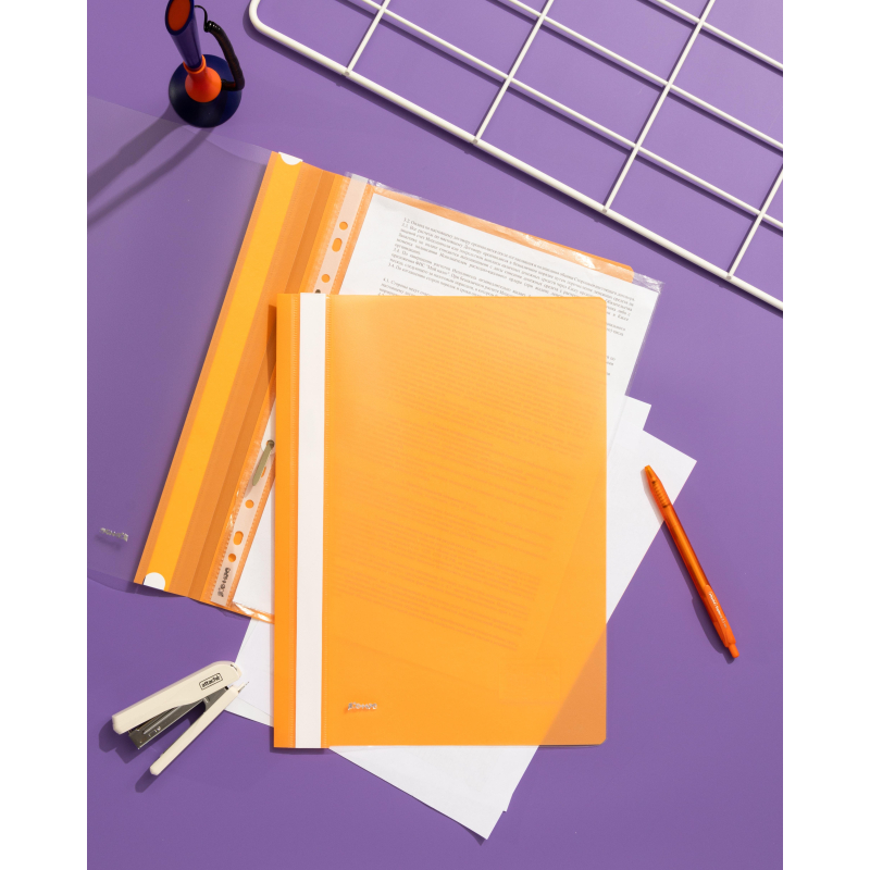 Скоросшиватель используется для хранения различного рода документации, для ведения документооборота, систематизации договоров, других важных бумаг. Папка изготовлена из гладкого пластика. Толщина верхнего прозрачного листа - 130 мкм, нижнего цветного листа - 180 мкм. С прозрачной верхней обложкой. На лицевой стороне находится карман с белым бумажной полосой для указания содержания, вместимость - 100 листов стандартной плотности. Цвет- оранжевый