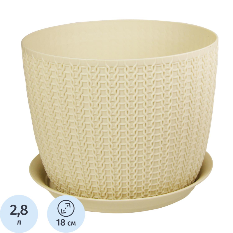Кашпо для цветов "М-пластика Вязание" белого цвета. Изготовлено из прочного пластика, устойчивого к воздействию ультрафиолетовых лучей. Кашпо состоит из несколько комплектующих: кашпо, поддон. Материал: полипропилен. Объем: 2.8 л. Диаметр: 18 см. Высота: 14 см.