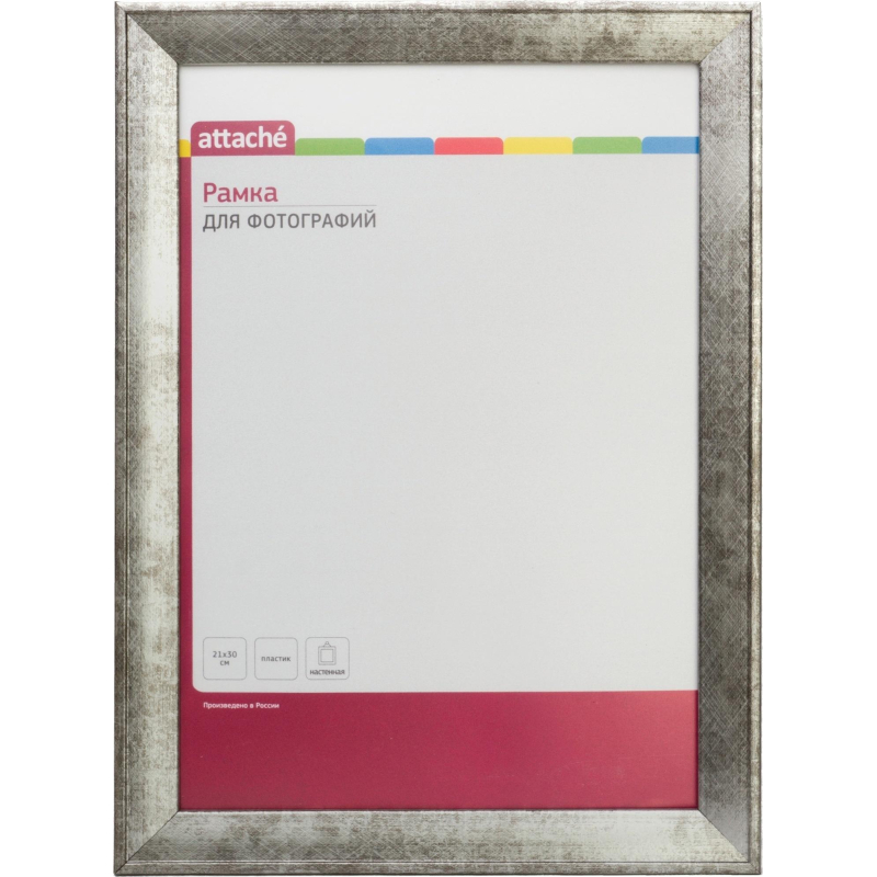 Рамка Attache А4 21х30 см пластиковый багет 25 мм серебристая - пластиковая рамка, которая поможет вам оригинально и стильно дополнить интерьер помещения, а также позволит сохранить память о дорогих вам людях и интересных событиях вашей жизни. Оборотная сторона рамки оснащена надежным подвесом, благодаря которому ее можно повесить на стену - как в доме, так и в офисе! Рамка Attache - не только яркое и стильное дизайнерское решение, но и прочная защита для ваших воспоминаний! Материал багета: пластик. Материал вставки: пластик. Материал задника: картон. Толщина багета: 14 миллиметров. Ширина багета: 25 миллиметров. Цвет багета: серебристый. Вставка съемная. Тип размещения: настенный. Тип крепления задника: лепестки. Размер фото: 21x30 сантиметров. Размер изделия: 25x34 сантиметров. Упаковка: пленка.