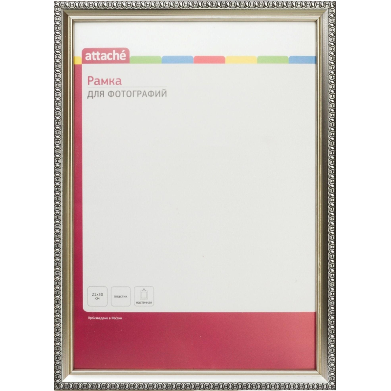 Рамка Attache А4 21х30 см пластиковый багет 17 мм серебристая - пластиковая рамка, которая поможет вам оригинально и стильно дополнить интерьер помещения, а также позволит сохранить память о дорогих вам людях и интересных событиях вашей жизни. Оборотная сторона рамки оснащена надежным подвесом, благодаря которому ее можно повесить на стену - как в доме, так и в офисе! Рамка Attache - не только яркое и стильное дизайнерское решение, но и прочная защита для ваших воспоминаний! Материал багета: пластик. Материал вставки: пластик. Материал задника: картон. Толщина багета: 13 миллиметров. Ширина багета: 17 миллиметров. Цвет багета: серебристый. Вставка съемная. Тип размещения: настенный. Тип крепления задника: лепестки. Размер фото: 21x30 сантиметров. Размер изделия: 25x34 сантиметров. Упаковка: пленка.