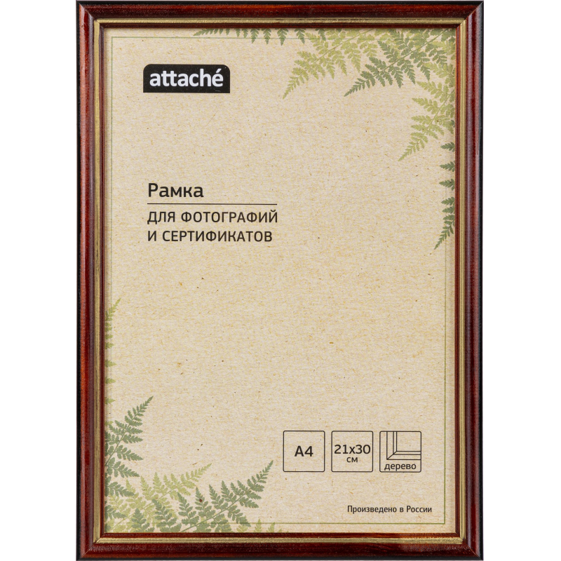 Рамка Attache А4 21x30 см деревянный багет 17 мм коньяк - настенная рамка для сертификатов, дипломов и других демонстрационных материалов. Рамка изготовлена из деревянного лакированного багета и оснащена защитным стеклом, что придает ей особую прочность. Настольное размещение невозможно. Рамка Attache - это стильный и практичный выбор для надежного хранения фотографий, документов, сертификатов, а также отличное решение для вашего интерьера! Материал багета: дерево. Материал вставки: стекло. Материал задника: картон. Толщина багета: 14 миллиметров. Ширина багета: 17 миллиметров. Цвет багета: коньяк. Вставка съемная. Тип размещения: настенный. Тип крепления задника: лепестки. Размер фото: 21x30 сантиметров. Размер изделия: 23x32 сантиметров. Упаковка: пленка.