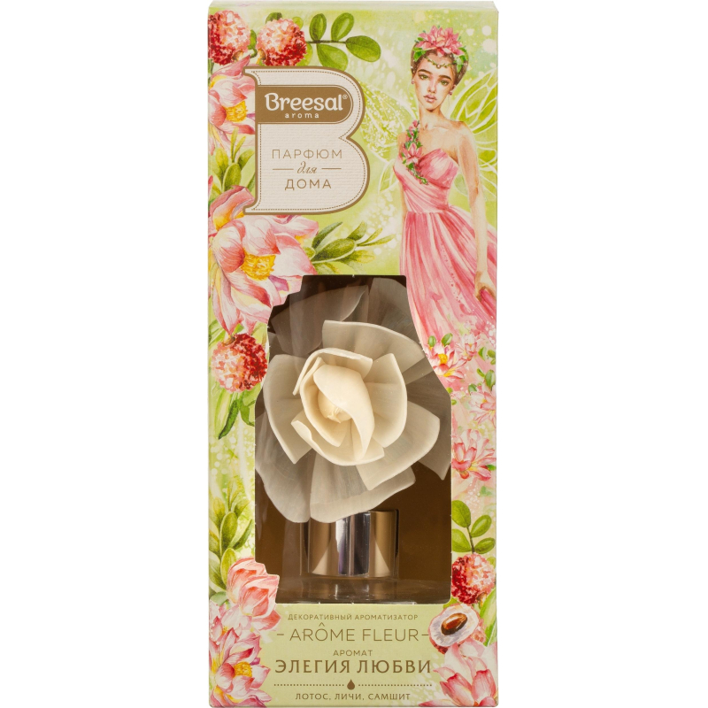 Аромадиффузор Breesal Arome Fleur 'Элегия любви' украшен декоративным цветком из рисовой бумаги. Выполненный вручную цветок в утонченном стеклянном флаконе с парфюмерной жидкостью. Стильный дизайн этого модного ароматического аксессуара украсит любой интерьер. Ноты аромата: лотос, личи, самшит. Способ применения: 1. Откройте упаковку, достаньте флакон с ароматической жидкостью и цветок, при наличии крышки удалите ее из флакона. 2. Наденьте декоративный колпак, опустите цветок в ароматическую жидкость. 3. Поставьте ароматизатор на ровную горизонтальную поверхность и наслаждайтесь ароматом. Объем: 60 мл. Срок службы: до 45 дней. Размер: 80x80x110 мм.