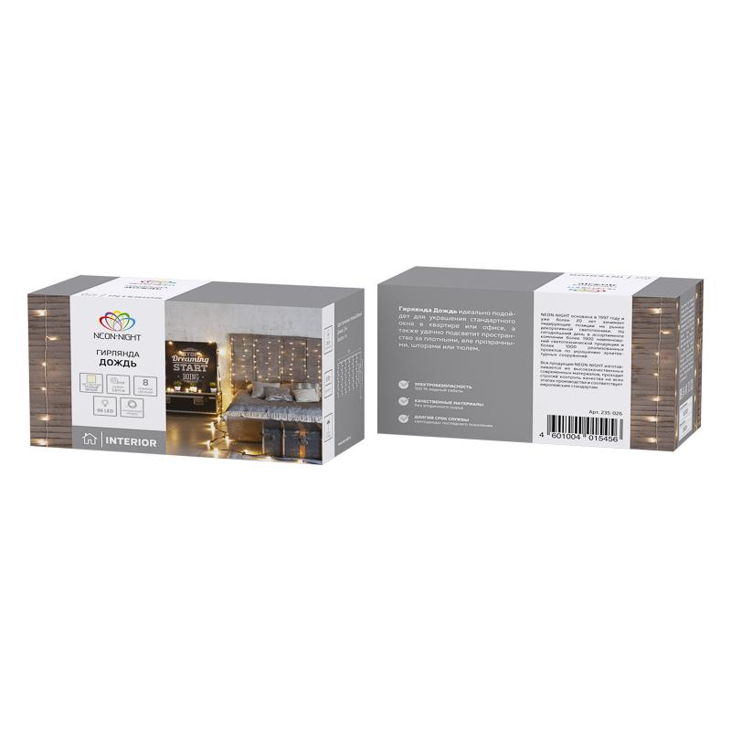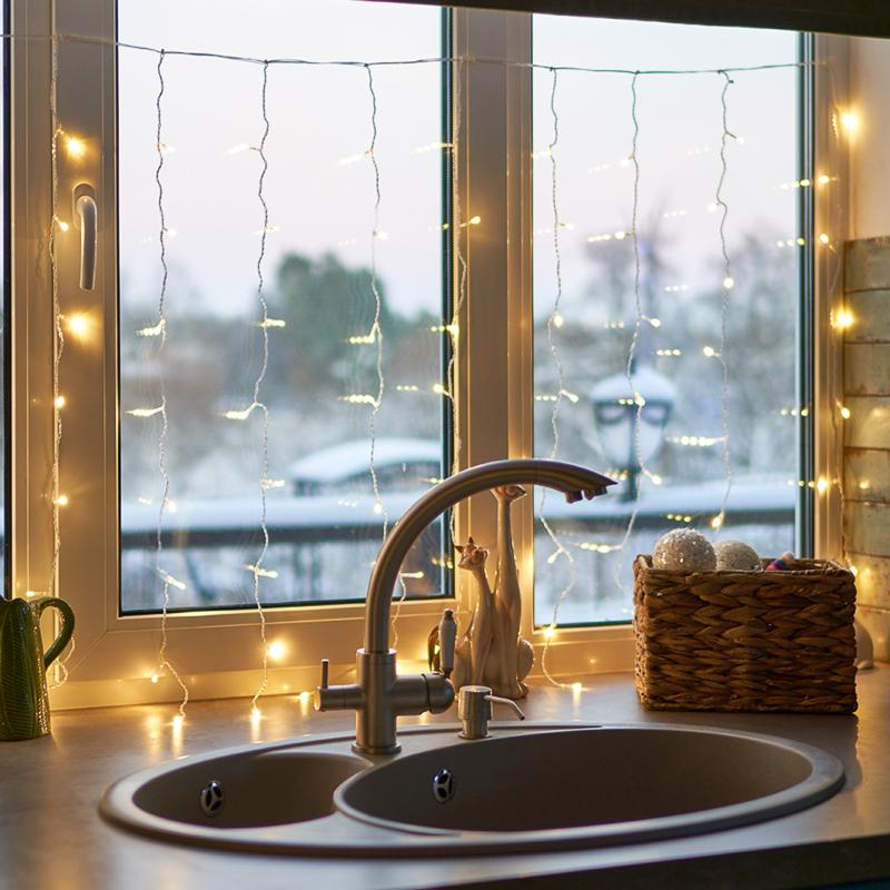 Гирлянда светодиодная Neon-Night Дождь занавес теплый белый свет 96 светодиодов (1.5x1 м). Гирлянда Светодиодный Дождь, предназначенная для размещения в помещении, представляет собой гибкий горизонтальный шнур-шину, к которому через определенные промежутки крепятся вертикальные нити (12 шт.) равной длины со светодиодами. Данная гирлянда предназначена для домашнего использования и идеально подойдет для украшения стандартного окна в квартире или офисе, а так же удачно подсветит пространство за плотными еле прозрачными шторами или тюлем. Сегодня в гирляндах источником света служат светодиоды, которые пришли на смену применявшимся ранее лампам накаливания. С полупроводниковыми источниками гирлянда стала более надежной, потребляет меньше электроэнергии, обрела более насыщенное сияние. Гирлянда выполнена в виде основного шнура, с которого свисают нити с расположенными на них 96 светодиодами. Светодиоды более надежны, экономны и не нагреваются.Степень защиты - IP 20. Контроллер с 8 режимами.Режимы свечения: свечение с динамикой.Технические характеристики:- Температурный режим: от 20 до +40 градусов C;- Длина гирлянды: 1.5 м;- Длина дополнительных линий: 1 м;- Длина шнура: 3 м;- Питание: от сети 220 В. Товар имеет степень защиты IP20 - защита корпуса от проникновения частиц диаметром 12.5 мм и более, без защиты от воды или брызг.