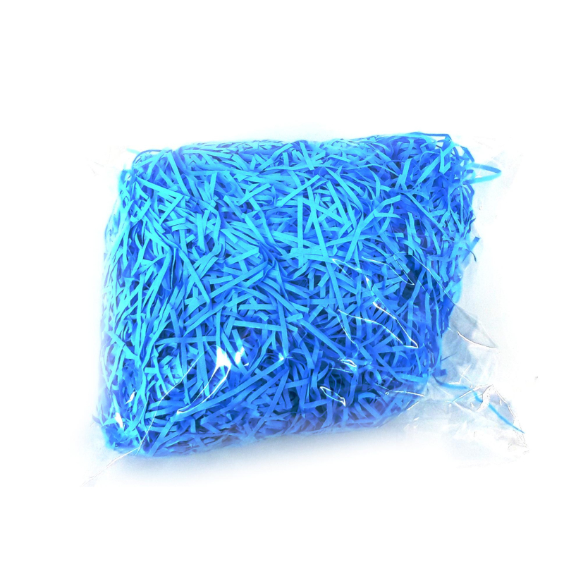 Бумажный наполнитель цветной синий, ширина полос 1.5-2 мм, упакован в полипропиленовый пакет. Масса наполнителя: 100 г. Материал: бумага.