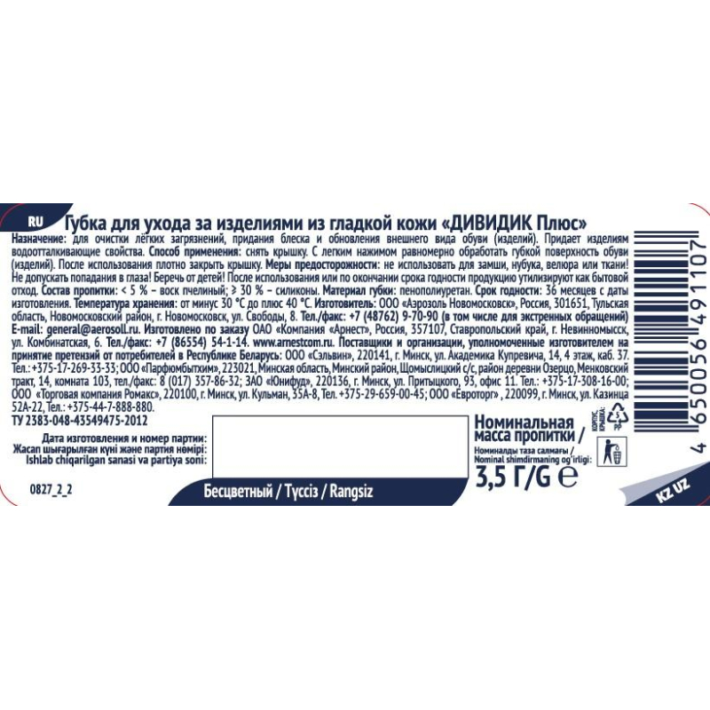 Губка для обуви "Дивидик Плюс" бесцветная очищает, обновляет цвет, придает естественный блеск изделиям из гладкой кожи. Обеспечивает до 35 качественных чисток. Пропитка в губке распределяется точечным образом в концентрированном виде. Нет жирности при первой чистке, экономичный расход вещества.