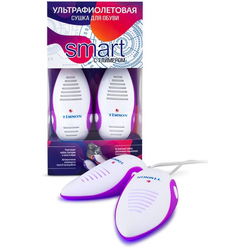 Ультрафиолетовая сушилка для обуви Timson Smart является уникальным высокоэффективным изобретением. Незаменима в быту, как лучший способ бережно просушить обувь, сохраняя ее форму и структуру. Сочетание тепла и ультрафиолета уничтожает бактерии, грибки и неприятный запах в обуви, а также предотвращает их появление. Энергоемкая, потребление всего 9 Вт. Таймер обеспечивает автоматическое отключение, по окончанию обработки, через 8 часов. Нагревательные элементы, УФ-излучатели и расположение конвекционных окошек прибора продуманы до мелочей, для максимально равномерной обработки обуви. Можно использовать для дезинфекции открытой обуви (радиус действия УФ-излучения 15 см). Подходит для обуви от 34 размера и больше. Функция автоматического отключения Smart Technology по завершению процесса сушки и обработки позволяет: - значительно усилить безопасность прибора в случае, если его забудут выключить; - экономить потраченную энергию (до 25%); - увеличить срок службы (на 50%); По завершению сушки и обработки обуви прибор автоматически отключается через 8 часов. Если обувь просохла недостаточно, рекомендуется включить изделие повторно. Производитель гарантирует работоспособность прибора в течение 24 месяцев с момента продажи.