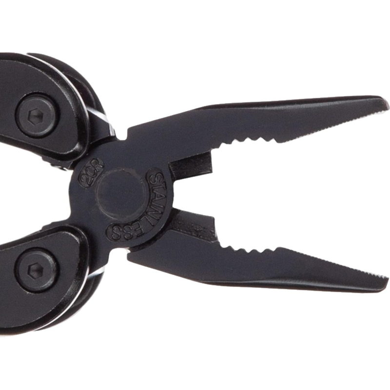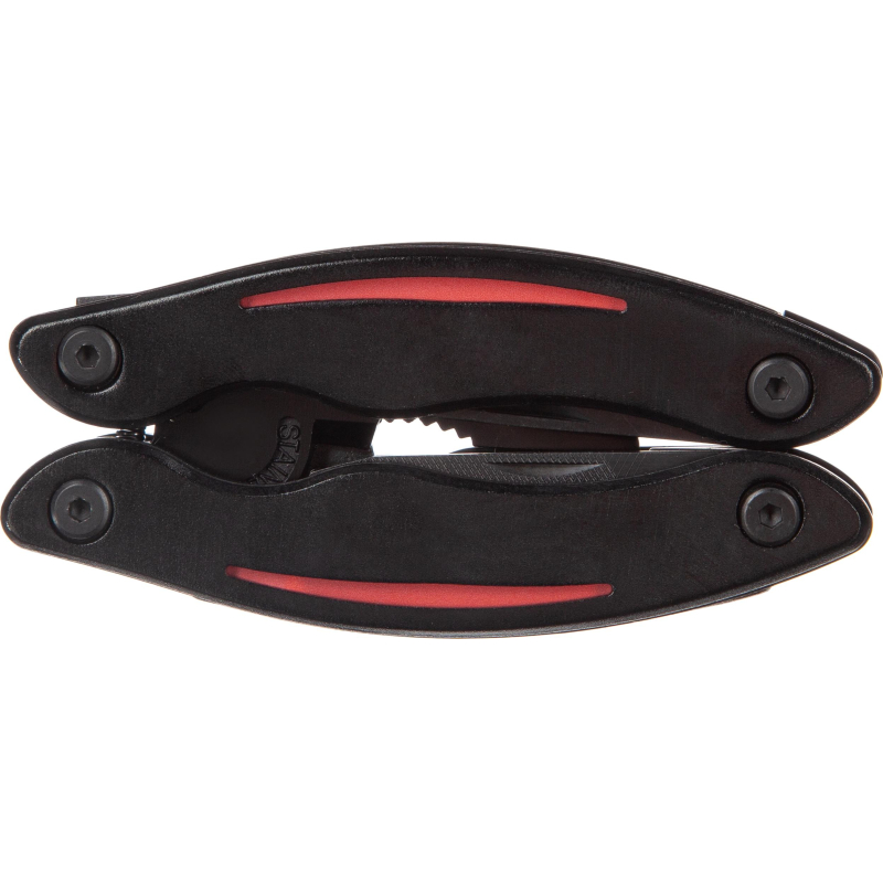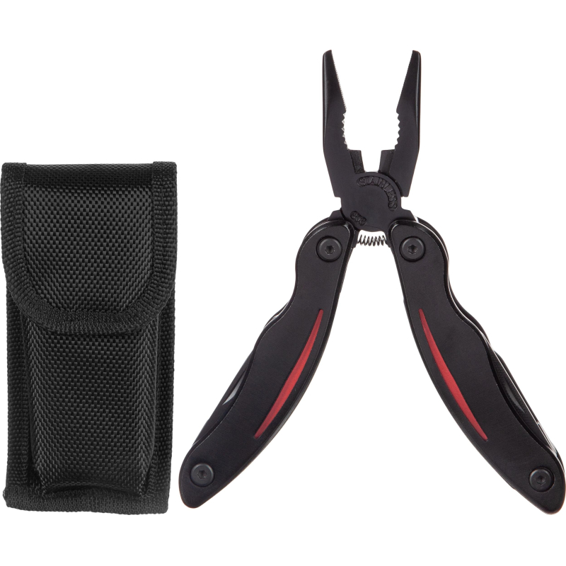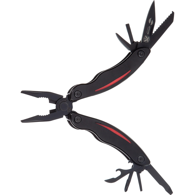 Мультитул Stinger 9 функций чёрный В состав мультитула входят 9 инструментов, которые выполняют 12 функций. Для изготовления инструмента использована нержавеющая сталь Cr2, которая прекрасно отвечает требованиям к мультитулу в данном ценовом диапазоне. Все инструменты, включая рукоятку имеют покрытие черного цвета. В закрытом состоянии мультитул имеет удобную округлую форму и с учетом красных вставок на рукоятках очень эффектно выглядит. На плоскогубцах имеется выштампованная надпись Stainless 2CR. На главном гладком лезвии нанесен логотип фирмы, надпись Stinger stainless steel и эмблема компании. Мультитул убирается в нейлоновый чехол, который можно подвесить на ремень. Рукоятки карманного инструмента округлой формы и не режут руки, даже при значительном усилии. Изготовлены они из нержавеющей стали с пластиковыми вставками красного цвета. Пассатижи подпружинены, что значительно повышает удобство работы. В состав мультитула входят: - плоскогубцы; - напильник по дереву и металлу; - отвертка плоская; - отвертка крестовая; - открывалка для бутылок и консервов; - нож; - скайдер для чистки рыбы; - пила; - шило. Размер - 10.5x5 см. Поставляется в картонной коробке.