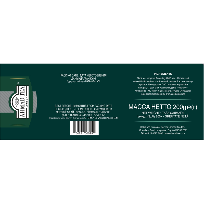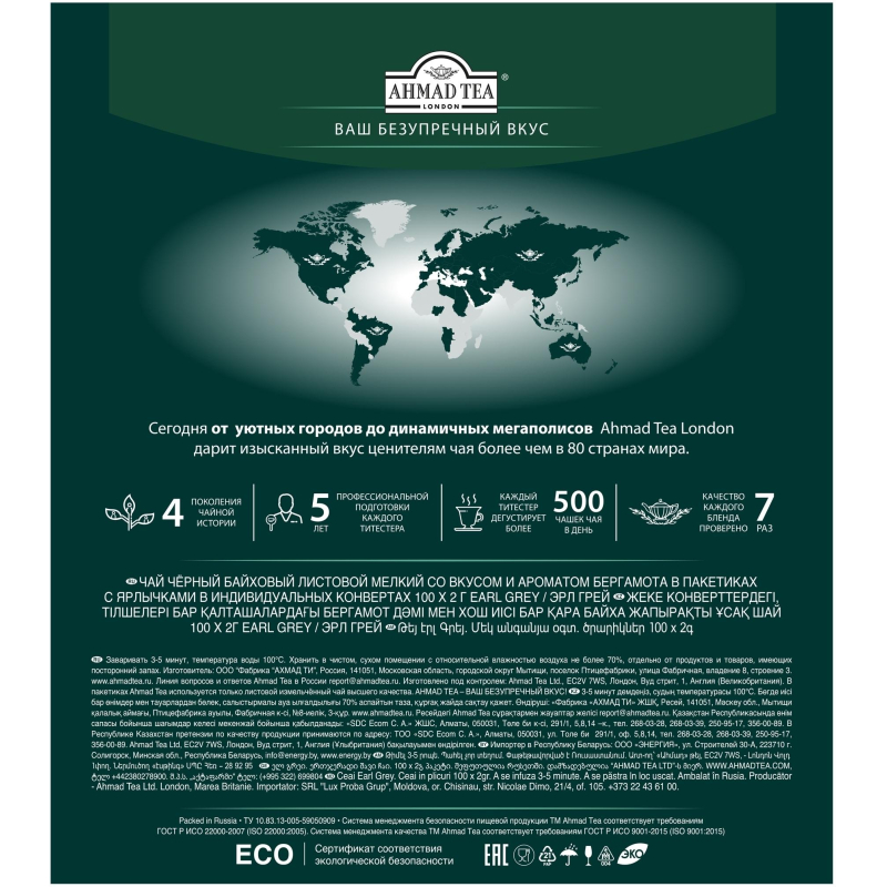 Чай Ahmad Earl Grey черный с бергамотом 100 пакетиков. Популярный чай Ahmad Earl Grey - черный байховый с бергамотом, 100 пакетиков - практичный выбор как для офиса, социального учреждения или заведения общепита, так и для дома. Продукт удобен в хранении и использовании. Во вкусе Ahmad Earl Grey ощущается гармоничное сочетание благородной крепости цейлонского чая и тонких цитрусовых ноток бергамота. Аромат свежезаваренного напитка освежает, дарит бодрость. Для заваривания требуется кипяток в расчете 200 мл на пакетик. Такой пропорции достаточно для получения кружки крепкого напитка. Настаивание занимает 5 минут, после этого можно наслаждаться ярким букетом и великолепным вкусом чая Ahmad Earl Grey. После заваривания пакетик следует убрать из чашки, чтобы не появилась горчинка от излишней крепости. Можно добавить сахар и дольку лимона или сдобрить молоком. Напиток превосходно сочетается с выпечкой, кондитерскими изделиями. Высокое качество продукта позволяет без сомнений купить черный чай Ahmad Tea Earl Grey не только для повседневного употребления, но и для праздника, 100 пакетиков хватит на большое количество гостей.Состав: чай черный байховый мелкий, пищевой ароматизатор 'бергамот'.Способ приготовления: залейте чайный пакетик горячей воды, дайте чаю настояться 5-7 минут.Количество пакетиков в упаковке: 100 штук.Тип упаковки: картонная коробка.Условия хранения: хранить в чистом, хорошо вентилируемом помещении без посторонних запахов при относительной влажности воздуха не более 70%.Страна производства: Россия.
