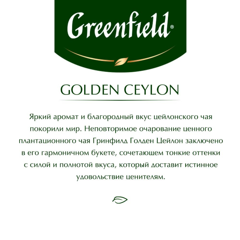 Чай черный Greenfield Golden Ceylon 25 пакетиков. Черный чай Greenfield Golden Ceylon произведен из элитного цейлонского сырья. Тонкий нюанс пряного благородного вкуса подчеркнут изысканным ярким ароматом. Напиток впечатляет золотисто-янтарным красивым оттенком. Черный чай Greenfield Golden Ceylon уложен в 25 бумажных фильтровальных пакетиков. Они помещены в индивидуальные фольгированные упаковки. Фольга оптимально сохраняет свойства продукта, препятствует отсыреванию, проникновению посторонних запахов, защищает от ультрафиолета.Состав: чай черный байховый.Способ приготовления: залейте чайный пакетик горячей воды, дайте чаю настояться 5-7 минут.Количество пакетиков в упаковке: 25 штук.Тип упаковки: картонная коробка.Условия хранения: хранить в чистом, хорошо вентилируемом помещении без посторонних запахов при относительной влажности воздуха не более 70%.Страна производства: Россия.