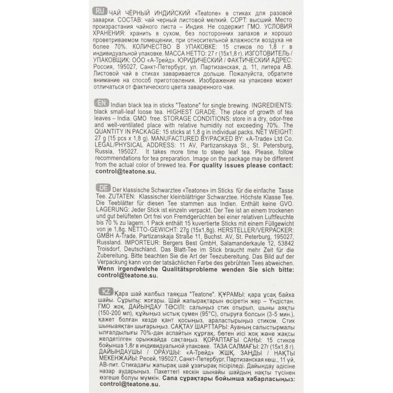 Чай черный Teatone Black Tea 15 стиков. Изысканный черный чай Teatone, сохранивший природное совершенство верхних листочков, собранных вручную на высокогорных плантациях. Благодаря вакуумной упаковке каждого стика при извлечении не оставляет капель и брызг. Насладитесь вкусовым богатством классического черного чая.Состав: чай черный байховый мелкий.Способ приготовления: залейте стик горячей водой, дайте чаю настояться 3-5 минут.Количество пакетиков в упаковке: 15 штук.Тип упаковки: картонная коробка.Условия хранения: хранить в чистом, хорошо вентилируемом помещении без посторонних запахов при относительной влажности воздуха не более 70%.Страна производства: Россия.