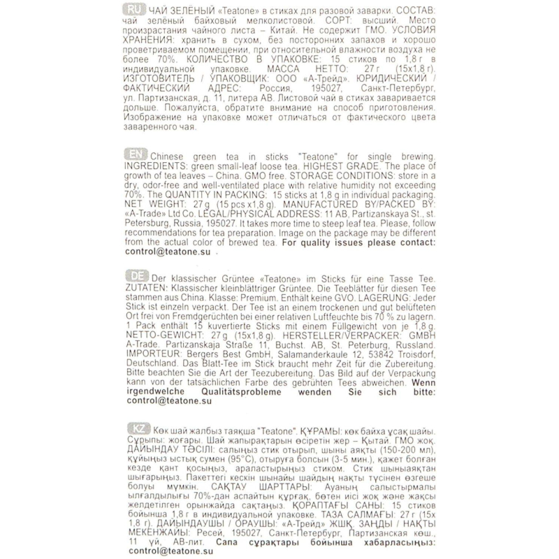 Чай зеленый Teatone 15 стиков. Вековые традиции выращивания и заваривания превратили зеленый чай в особый напиток, вкус и аромат которого несут умиротворяющую гармонию и ясность мысли. Деликатный зеленый чай сочетается с любым настроением и временем суток. Благодаря вакуумной упаковке каждого стика при извлечении не оставляет капель и брызг.Состав: чай зеленый листовой мелкий.Способ приготовления: залейте стик горячей водой, дайте чаю настояться 3-5 минут.Количество пакетиков в упаковке: 15 штук.Тип упаковки: картонная коробка.Условия хранения: хранить в чистом, хорошо вентилируемом помещении без посторонних запахов при относительной влажности воздуха не более 70%.Страна производства: Россия.