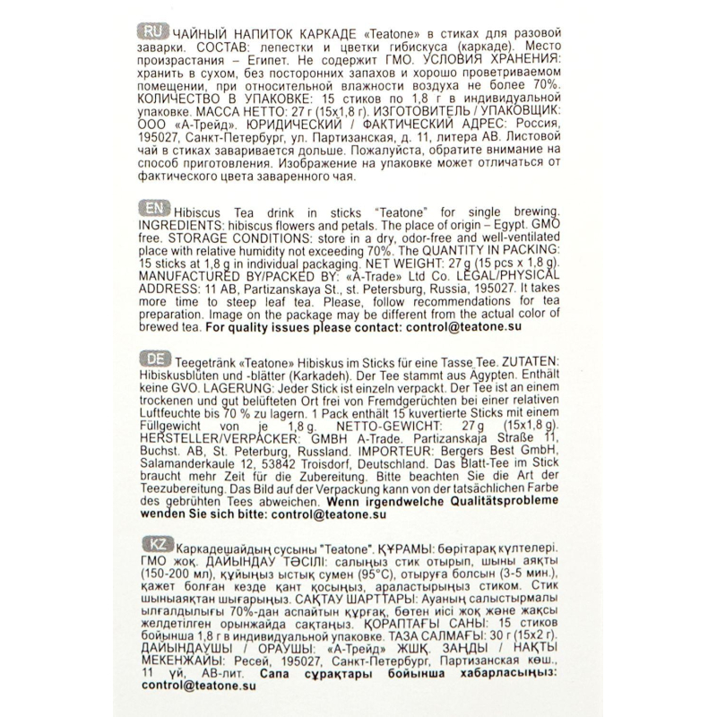 Чай каркаде Teatone Hibiscus 15 стиков. Каркаде - восточный чай с тысячелетней историей, получивший статус напитка фараонов за благородный рубиновый оттенок, легкую освежающую кислинку и терпкий вкус суданской розы. Каркаде подается как горячим, так и холодным. Благодаря вакуумной упаковке каждого стика при извлечении не оставляет капель и брызг.Состав: лепестки гибискуса (суданская роза).Способ приготовления: залейте стик горячей водой, дайте чаю настояться 3-5 минут.Количество пакетиков в упаковке: 15 штук.Тип упаковки: картонная коробка.Условия хранения: хранить в чистом, хорошо вентилируемом помещении без посторонних запахов при относительной влажности воздуха не более 70%.Страна производства: Россия.