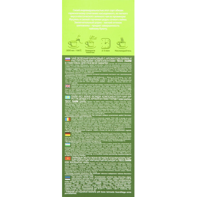 Чай зеленый Tess Lime Citrus peels 100 пакетиков. Чай Tess Lime Citrus peels зеленый с цедрой цитрусовых 100 пакетиков - невероятный напиток, с сочным, освежающим и пробуждающим вкусом классического зеленого чая и приятной горчинкой цедры лимона. Нежные нотки шиповника вносят финальный штрих в великолепный букет витаминного настоя, наполняя его солнечным светом и летним теплом. Чашка прекрасного Tess Lime Citrus peels подарит яркие и приятные чаепития, создавая лучшие моменты в течение сложного и тяжелого трудового дня или спокойных выходных. Кроме прекрасного вкуса, лаймовый чай может похвастаться богатым составом витаминов, минералов и антиоксидантов. Напиток отличного самочувствия с шикарным вкусом. Он справится с жаждой и согреет в прохладных помещениях, наполнит энергией и поможет расслабиться, восстановит силы и внимание или настроит на крепкий и качественный сон. Чтобы приготовить чашку нежного настоя вскипятите воду и залейте один или несколько чайных пакетиков, в зависимости от количества персон. Дайте им настояться 2-3 минуты и удалите пакетик из чая. Наслаждайтесь чистым вкусом чая или добавьте ложечку тростникового сахара, чтобы получился интересный, десертный напиток. Tess Lime Citrus peels идеален как в горячем, так и холодном варианте. Приятного чаепития!Состав: чай зеленый байховый, лимонное сорго, плоды шиповника, цедра цитрусовых, лепестки календулы, натуральный ароматизатор ?лайм?.Способ приготовления: заварить чайный пакетик в чашке или заварочном чайнике кипяченой водой и настоять 2-3 минуты.Количество пакетиков в упаковке: 100 штук.Тип упаковки: картонная коробка.Условия хранения: хранить в чистом, хорошо вентилируемом помещении без посторонних запахов при относительной влажности воздуха не более 70%.Страна производства: Россия.