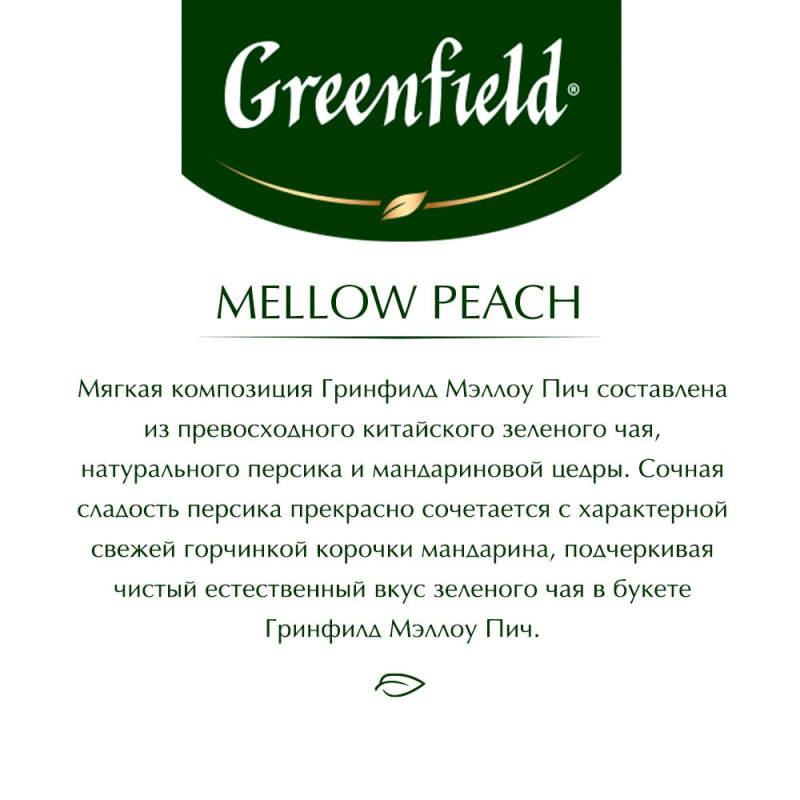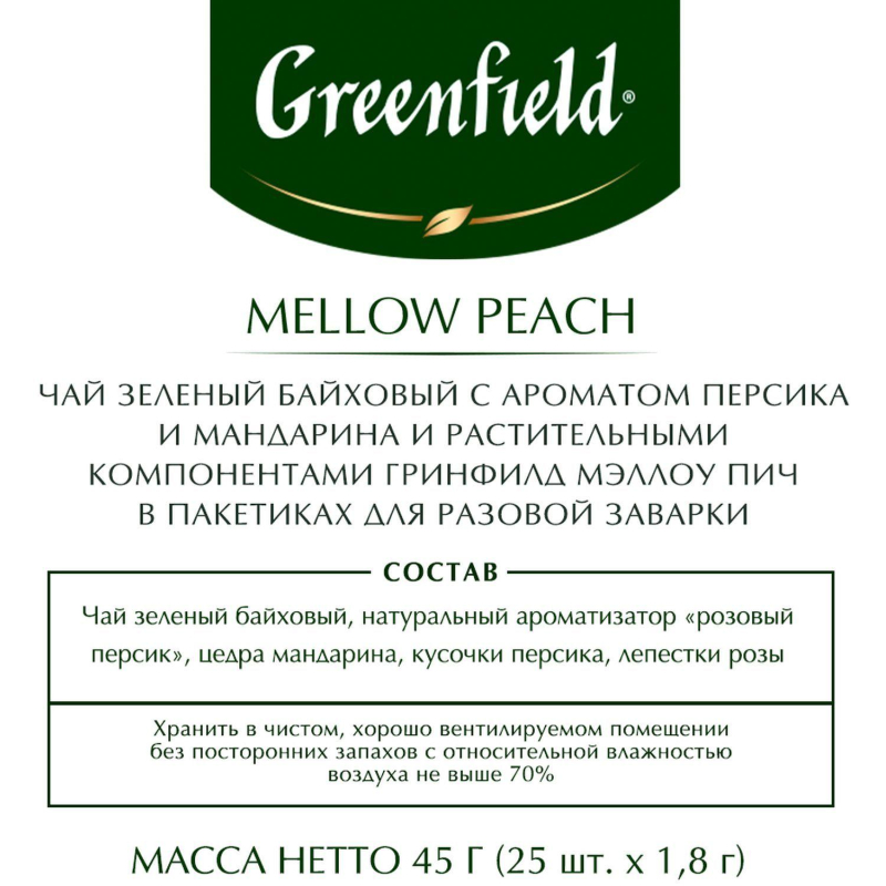 Чай зеленый Greenfield Mellow Peach 25 пакетиков. Чай Greenfield Mellow Peach зеленый с персиком и мандарином. Мягкая композиция Greenfield Peach Mellow составлена из превосходного китайского зеленого чая, натурального персика и мандариновой цедры. Сочная сладость персика прекрасно сочетается с характерной свежей горчинкой корочки мандарина, подчеркивая чистый естественный вкус зеленого чая в букете Greenfield Peach Mellow.Состав: чай зеленый байховый, ароматизатор розовый персик, цедра мандарина, кусочки персика, лепестки розы. Способ приготовления: заварить чайный пакетик в чашке или заварочном чайнике горячей водой и настоять 7-9 минут.Количество пакетиков в упаковке: 25 штук. Тип упаковки: картонная коробка.Условия хранения: хранить в чистом, хорошо вентилируемом помещении без посторонних запахов при относительной влажности воздуха не более 70%.Страна производства: Россия.