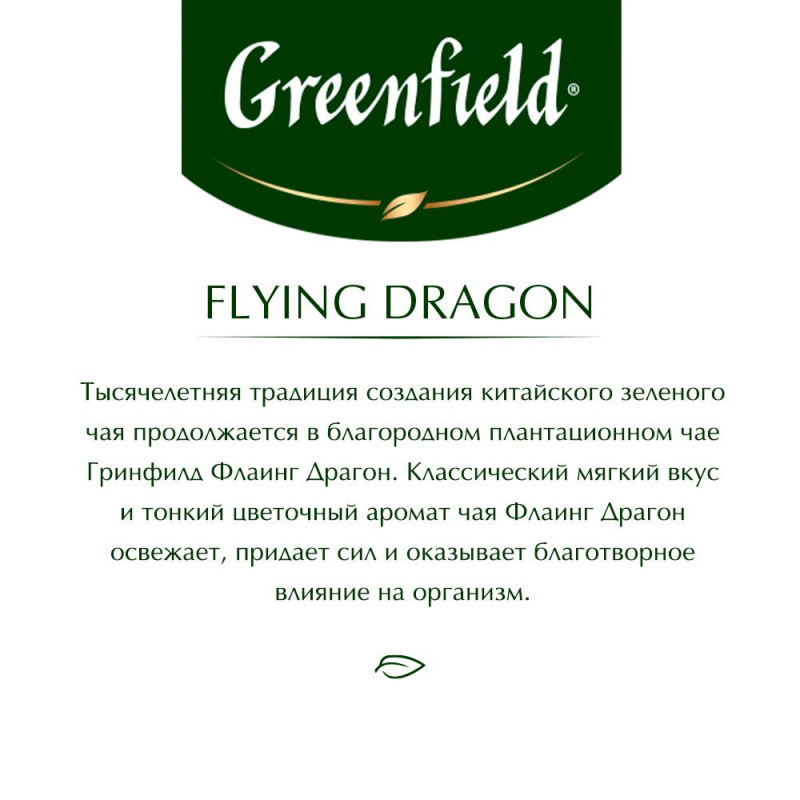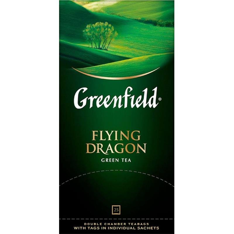 Чай зеленый Greenfield Flying Dragon 25 пакетиков. Чай зеленый Greenfield Flying Dragon изготовлен из листьев чайного куста, собранных в горной местности. Напиток оказывает освежающее и общеукрепляющее действие, характеризуется мягким вкусом и тонким цветочным ароматом. Чаинки имеют серебристый цвет и цилиндрическую форму.Состав: чай зеленый байховый.Способ приготовления: заварить чайный пакетик в чашке или заварочном чайнике кипяченой водой и настоять 2-4 минуты.Количество пакетиков в упаковке: 25 штук.Тип упаковки: картонная коробка.Условия хранения: хранить в чистом, хорошо вентилируемом помещении без посторонних запахов при относительной влажности воздуха не более 70%.Страна производства: Россия.