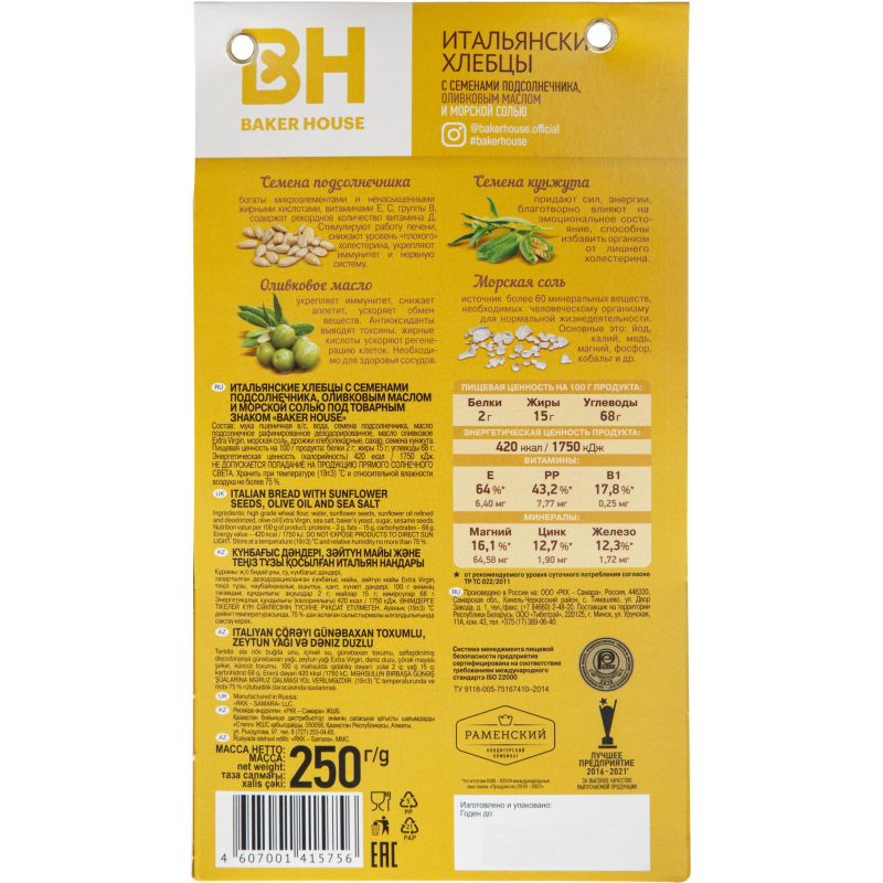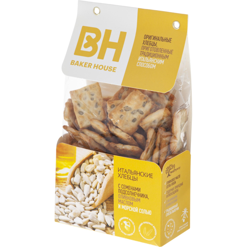 Хлебцы Baker House Итальянские с семенами подсолнечника, оливковым маслом и морской солью 250 г выпекаются согласно классической итальянской рецептуры, при производстве используются отборные семена подсолничнека и кунжута. Хлебцы богаты кальцием, йодом и железом, содержат витамины группы, А, D и Е, растительные жиры и полиненасыщенные жирные кислоты. Они прекрасно подойдут в качестве самостоятельной закуски, а также к супам, бульонам, салатам, паштетам и другим блюдам. Хлебцы можно отнести к постному продукту. Состав: мука пшеничная в/с, вода, семена подсолничнека, масло подсолнечное рафинированное дезодорированное, масло оливковое Extra Virgin, морская соль, дрожжи, сахар, семена кунжута. Пищевая ценность на 100 г продукта: белки - 8 г, жиры - 14 г, углеводы - 35 г. Энергетическая ценность на 100 г продукта: 300 ккал. Вес: 250 г. Срок годности: 4 месяца. Условия хранения: не допускать попадания на продукцию прямого солнечного света, хранить при температуре от +16 до 22°C и при относительной влажности воздуха не более 75%.