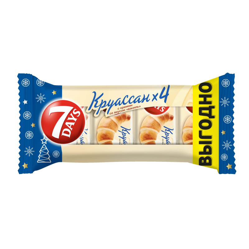 Нежный изысканный крем ваниль. Удобный формат мультиупаковки: 4 круассана 7DAYS. Удобно взять сразу про запас или угостить близких! Круассан 7DAYS - это идеальный перекус в любое время дня. Он удобно упакован и готов к употреблению. Великолепный дуэт воздушного слоеного теста и нежной начинки поможет притупить чувство голода и сделает ваш день восхитительным. Состав: Тесто - мука пшеничная х/п в/с, маргарин (пальмовое масло, вода питьевая, соль поваренная пищевая, эмульгатор (моно- и диглицериды жирных кислот), регулятор кислотности (лимонная кислота), консервант сорбат калия 0,1%), вода питьевая, сахар, глюкозный сироп, дрожжи хлебопекарные прессованные, стабилизатор (моно- и диглицериды жирных кислот), соль поваренная пищевая, ароматизатор, молокосодержащий продукт (молочный белок, стабилизатор (ксандовая камедь), эмульгатор (рапсовый лецитин), регулятор кислотности (лимонная кислота), консервант (пропионат кальция 0,1%). Начинка с ванильным вкусом 23% - сахар, пальмовое масло, вода питьевая, молоко сухое обезжиренное, декстроза, спирт этиловый ректификованный из пищевого сырья 'Люкс' 96,3% об., желток яичный сухой, эмульгатор (эфиры полиглицерина и жирных кислот), ароматизатор, консервант (сорбат калия 0,1%), лактоза. Продукт может содержать незначительное количество соевых продуктов, орехов. Противопоказано при непереносимости к белку молока. Вес: 260 г. Тип упаковки: пакет. Страна производства: Россия. Срок хранения: 150 дней. ТУ 9136-006-50894965-2004.