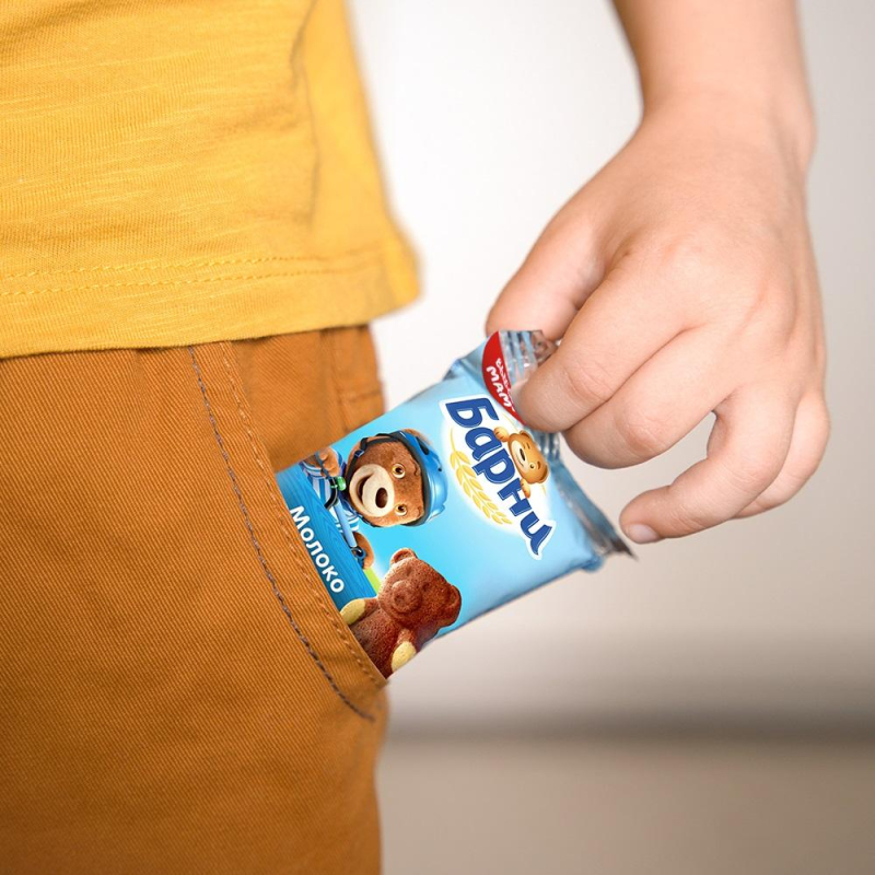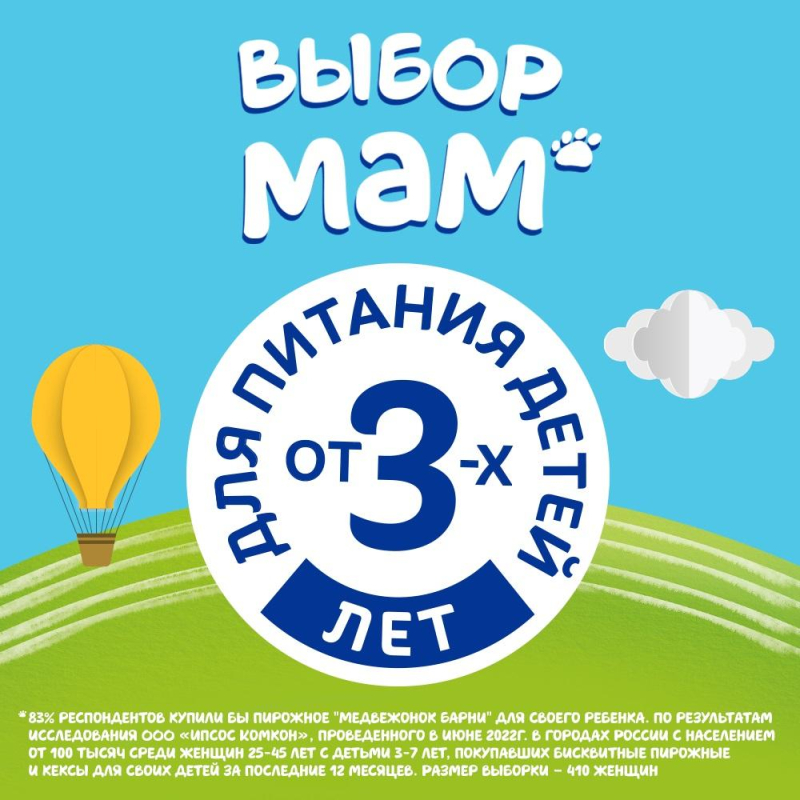 Пирожное бисквитное Медвежонок Барни с молочной начинкой 150 г. Бисквитное пирожное Барни с молочной начинкой - специально разработанное для детей кондитерское изделие в виде медвежонка, производится на основе натуральных ингредиентов: злаков и молочных продуктов. Обогащено кальцием, необходимым для здорового роста и развития детей, не содержит красителей и консервантов. Рекомендовано для детей дошкольного возраста от 3х лет. Медвежонок Барни - вкусный, полезный и питательный перекус, прекрасная альтернатива печенью, кексам или другой сладкой выпечке, отлично сочетается с соком, молоком, кефиром, йогуртом, чаем или какао, его удобно брать с собой в дорогу, давать ребенку в школу или на прогулку. Это отличный вариант сладкого угощения на детский праздник в детский сад, школу, на День рождения. В коробке пять пирожных в индивидуальных упаковках. Мишка Барни - это выбор мам, 83% мам купили бы этот вкусный десерт для своего ребенкаx. xПо результатам исследования ООО Ипсос Комкон, проведенного в июне 2022г в городах России с населением от 100 тысяч среди женщин 25-45 лет с детьми 3-7, покупавших бисквитные пирожные и кексы для своих детей за последние 12 мес.