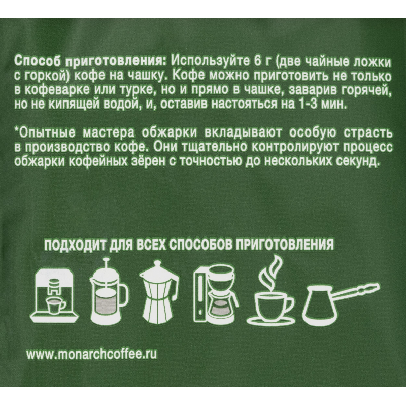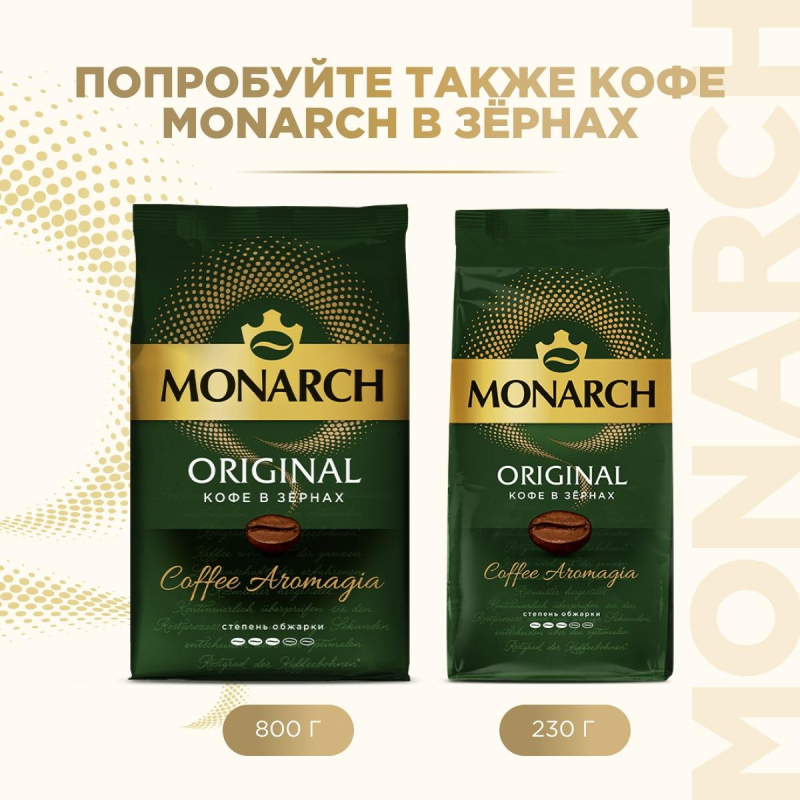 Богатый, насыщенный вкус и волшебная сила Аромагии остаются с вами в каждой чашке кофе Monarch. Мы сохраняем традиции отбора кофейных зерен высокого качества и мастерство обжарки, чтобы продолжать дарить вам богатый насыщенный вкус и аромат кофе. Кофе Monarch Original - великолепный вкус в каждой капле. Состав: кофе натуральный молотый. Степень обжарки: выше средней. Вид кофе: молотый. Степень помола: средняя. Способ приготовления: сварить кофе в кофеварке, турке или просто заварить в чашке. Вес: 230 г. Тип упаковки: вакуумный пакет. Условия хранения: закрытый пакет держать в сухом прохладном месте. Страна производства: Россия. ГОСТ Р 51881-2002, EAC.