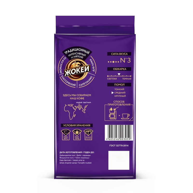 Молотый кофе Жокей Традиционный - густой и насыщенный кофе, с приятной горчинкой и легким сладковатым оттенком. Смесь зерен позволяет создать композицию, адресованную любителям настоящего крепкого кофе.<br><br>Состав: арабика, робуста.<br>Степень обжарки: средняя.<br>Вид кофе: молотый.<br>Степень помола: средняя.<br>Способ приготовления: приготовить в турке, френч-прессе или кофеварке.<br>Вес: 250 г.<br>Тип упаковки: вакуумный пакет.<br>Условия хранения: плотно закрытый пакет хранить в сухом прохладном месте.<br>Страна производства: Россия.<br>ГОСТ 52088.
