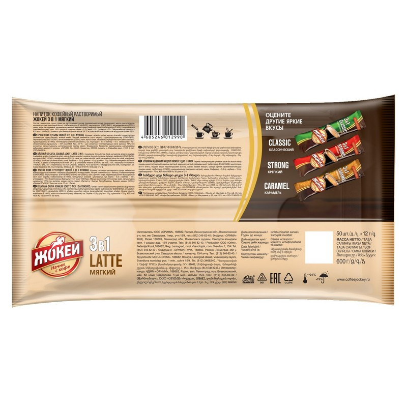 Кофе порционный Жокей 3 в 1. Мягкий (50 пакетиков в упаковке) - это растворимый кофе с сахаром и сливками. Настоящий кофе-латте с выраженным молочным вкусом. Состав: заменитель сухих сливок на растительной основе (крахмальная патока (пшеничная), масло растительное, казеинат натрия (молочный белок), стабилизаторы (Е340/Е452), эмульгаторы (Е471/Е481), антикомкователь (Е551)), сахар, кофе растворимый, карамелизированный жженый сахар (сахарный сироп, стабилизатор (Е1400)), подсластитель (цикламат натрия), соль. Вид кофе: растворимый. Способ приготовления: высыпать в чашку и залить горячей, но не кипящей водой. Вес: 600 г. Количество пакетиков в упаковке: 50 шт. Условия хранения: хранить в чистом, хорошо вентилируемом помещении без посторонних запахов с относительной влажностью воздуха не выше 70%. Страна производства: Россия.