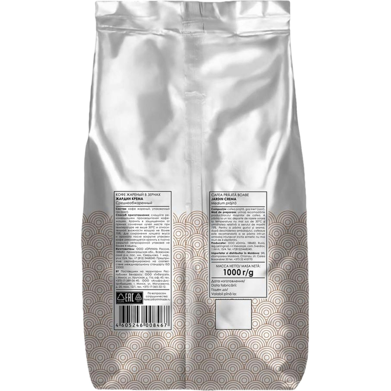 Кофе в зернах Jardin Crema. Уникальность этого сорта - в тщательно выверенной пропорции арабики и высококачественной робусты, которая придает бленду насыщенность и крепость. Вкус яркий, сильный, но без горчинки, поскольку зерна бережно и мягко обжарены. Jardin Crema хорошо сочетается с молоком или сливками для приготовления капучино или латте.Состав: 60% арабика, 40% робуста. Степень обжарки: средняя. Вид кофе: зерновой. Способ приготовления: приготовить в кофемашине, турке или кофеварке, предварительно перемолотые зерна. При приготовлении кофе в кофемашине следуйте рекомендациям производителя кофемашин. Вес: 1 кг. Тип упаковки: вакуумный пакет. Условия хранения: плотно закрытый пакет хранить в сухом прохладном месте. Страна производства: Россия.