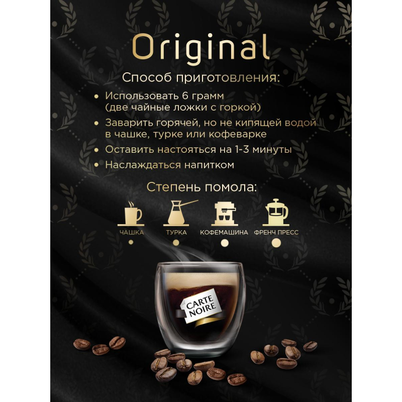 Кофе в зернах Carte Noire 800 г чудесный напиток из стопроцентной арабики Exclusif средней обжарки, растущей в самых известных кофейных регионах мира: Латинской Америке и Азии. Кропотливый отбор, идеальная очистка и профессиональная французская инновационная обжарка сделали Carte Noire любимым кофе многих стран. В удивительный процесс обжарки входят два контрастных по своей природе явления - Огонь и Лед. В тот момент, когда зерна уже на пике готовности, холодный поток останавливает обжарку, раскрывая таким образом глубокий насыщенный вкус каждого зернышка и нежный аромат со слегка горьковатыми шоколадными оттенками. Carte Noire - кофе No1 во Франции и признанный лидер премиального сегмента в России. Благодаря своему высокому качеству, Carte Noire очень быстро завоевал популярность и уважение как среди гурманов, так и среди экспертов. Великолепное обрамление и запоминающееся название воплощают в себе весь французский шарм и изящество. Черная упаковка с яркой золотой лентой, подчеркивает его роскошь и благородное происхождение. Кофе в зернах Carte Noire, пробуждающий желания, сделает ваше утро идеальным и поможет сосредоточиться в нужный момент на важном. А самое главное - вы будете наслаждаться волшебным вкусом! Приготовить его вы сможете в кофемашине, кофеварке или турке. Состав: 100% арабика. Степень обжарки: средняя. Вид кофе: зерновой. Способ приготовления: приготовить в кофемашине, турке или кофеварке, предварительно перемолотые зерна. Вес: 800 г. Тип упаковки: вакуумный пакет. Условия хранения: плотно закрытый пакет хранить в сухом прохладном месте. Страна производства: Россия.