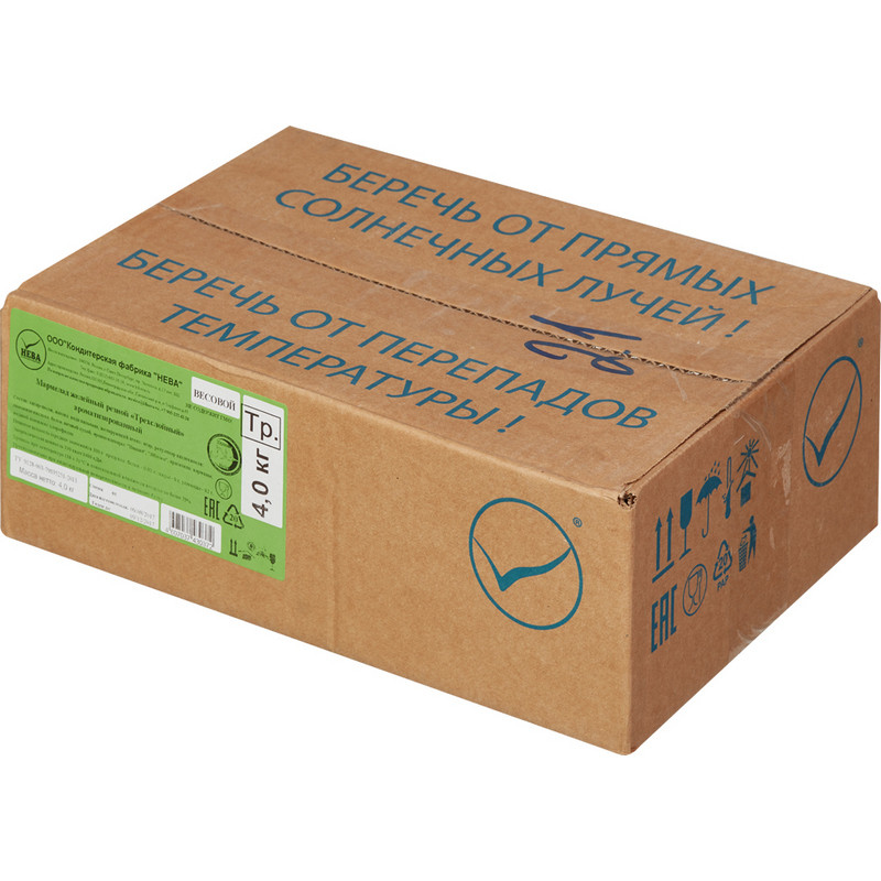 Мармелад Нева ассорти желейный фигурный - это традиционный желейный мармелад разнообразных фруктовых вкусов и форм, который не только доставит удовольствие, но и украсит ваш стол. Состав: фруктоза, вода, патока, желирующий агент: пектин, регулятор кислотности: кислота лимонная, влагоудерживающий агент: лактат натрия, ароматизаторы: Черешня, Лимон, Зеленое яблоко, натуральные красители: лютеин, антоциан, хлорофиллин. Пищевая ценность на 100 г продукта: углеводы - 85,10 г. Энергетическая ценность на 100 г продукта: 318 ккал. Вес: 4 кг. Тип упаковки: картонная. Срок годности: 4 месяца. Условия хранения: в сухом прохладном месте при температуре от 15 до 21 °С.