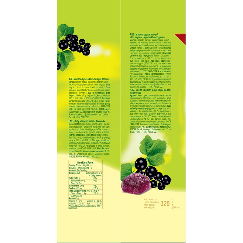 Мармелад от фабрики "Ударница" со вкусом черной смородины - это нежные желейные, легкие и полезные мармелады в форме ромбиков с натуральным составом и вкусом всеми любимой и полезной ягоды. Состав: Сахар, патока, желирующий агент - пектин, регуляторы кислотности - кислота молочная, кислота яблочная, кислота лимонная, цитрат калия 3-замещенный, ароматизатор 'черносмородиновый', краситель - антоциан (экстракт из кожицы винограда).