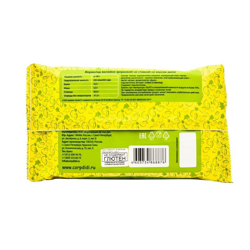 Мармелад без сахара желейно-формовой "Умные сладости" со вкусом дыни. Ароматный, в меру сладкий, с насыщенным вкусом дыни. В составе натуральный подсластитель на основе стевии. Изготовлен без добавления фруктозы и сахара. Состав: патока, подсластитель изомальт, желирующий агент-пектин, регулятор кислотности- кислота лимонная, влагоудерживающий агент-лактат натрия, ароматизатор "Дыня", подсластитель экстракт стевии (стевиозид). Энергетическая ценность 220 кКал/920 кДж. Белки 0,3г. Жиры 0,3г. Углеводы 62,6г. Углеводы без сахароспиртов 41,3г. В ста граммах продукта содержится не более 5,5ХЕ (Хлебных Единиц). Срок годности: 6 месяцев. Условия хранения: при температуре не более 21 градуса Цельсия и относительной влажности не более 75%. Масса нетто: 200 грамм. Производитель: ООО "Корпорация "Ди энд Ди". Страна производства: Россия.