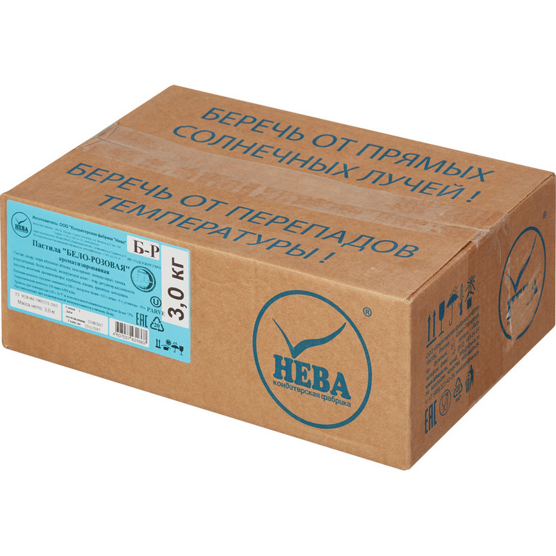 Пастила Нева бело-розовая имеет прекрасный вкус и оригинальный - двухслойный - вид. Подойдет в качестве дополнения к чаю или кофе всем, кто любит сладкое! Состав: сахар, патока, пюре яблочное (яблоки, консервант диоксид серы), вода питьевая, белок яичный, агент желирующий агар, регулятор кислотности кислота молочная, ароматизаторы Клубника, Ваниль), краситель антоцианы. Пищевая ценность на 100 г продукта: белки: 0,5 г, углеводы: 83 г. Энергетическая ценность на 100 г продукта: 330 ккал. Вес: 3 кг. Тип упаковки: картонная. Срок годности: 3 месяца. Условия хранения: в сухом прохладном месте при температуре от 15 до 21 °С.