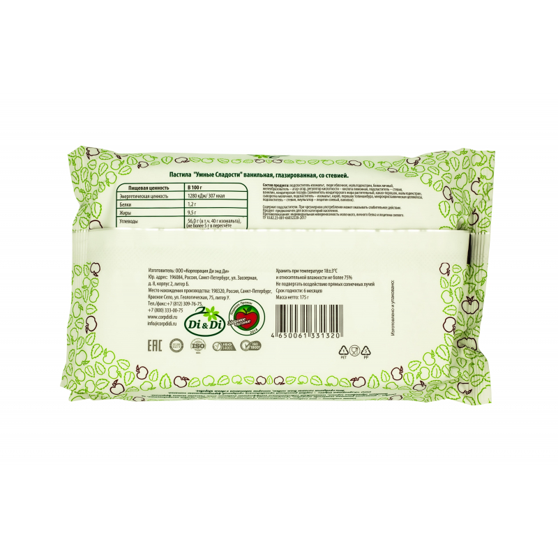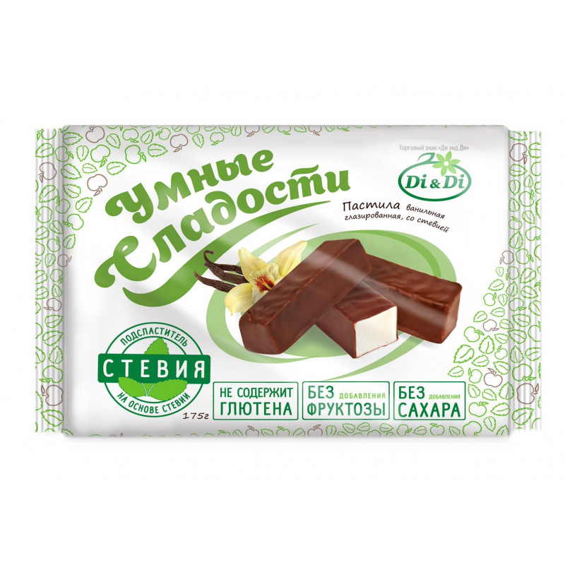 Пастила ванильная "Умные сладости" без сахара в глазури - вкусное, очень полезное и малокалорийное лакомство. Производится на основе натурального яблочного пюре. Нежная, в меру сладкая пастила с нежным ароматом ванили. Состав: подсластитель изомальт, патока, кондитерская глазурь (заменитель кондитерского жира лауриновый, какао-порошок, мальтодекстрин, сыворотка молочная, подсластитель -изомальт, порошок плодов рожкового дерева, порошок топинамбура, микрокристаллическая целлюлоза, подсластитель-экстракт стевии (стевиозид), эмульгатор - лецитин соевый, ванилин), пюре яблочное, мальтодекстрин, ароматизатор "ваниль", белок сухой яичный, желеобразователь-агар-агар, регулятор кислотности - кислота лимонная, ванилин, влагоудерживающий агент-лактатнатрия, загуститель - ксантановая камедь, подсластитель экстракт стевии (стевиозид). Белки - 1,2г. Жиры - 9,5г. Углеводы - 56,0г (в т.ч. изомальта 40 г, не более 5г в пересчете на сахарозу). В ста граммах продукта содержится не более 4,5 ХЕ Энергетическая ценность: 307ккал/1280 кДж Срок годности: 4 месяца. Условия хранения: при температуре не более 21 градуса Цельсия и относительной влажности не более 75%. Масса нетто: 160 грамм. Производитель: ООО "Корпорация "Ди энд Ди". Страна производства: Россия.
