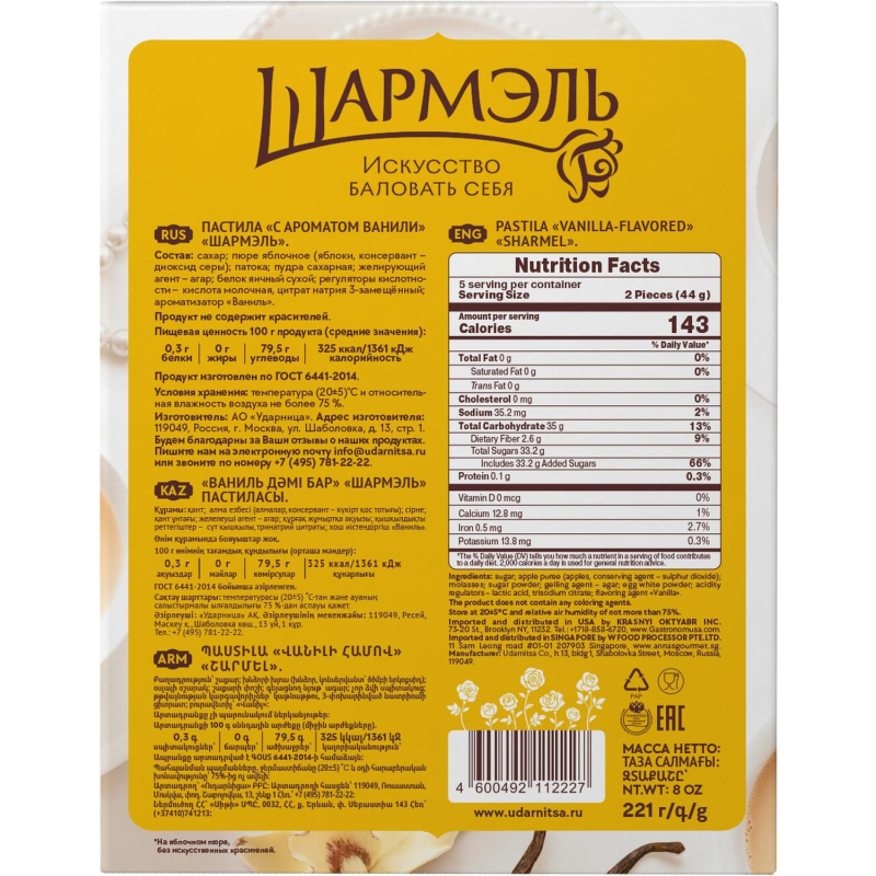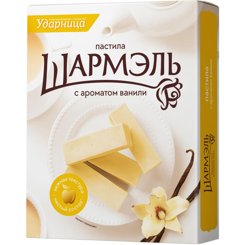 Пастила с ароматом ванили Шармэль Масса нетто: 221 г Состав: сахар - песок, пюре яблочное, патока, пудра сахарная, желеобразователь - агар, белок яичный сухой, регуляторы кислотности - кислота молочная, цитрат натрия, порошок яблочный, ароматизатор. Пищевая ценность на 100 г продукта: белки: 0.5 г углеводы: 79 г Энергетическая ценность на 100 г продукта: 320 ккал. Условия хранения: хранить при температуре не более 25 градусов Цельсия и относительной влажности воздуха не более 30-75%. Страна производства: Россия