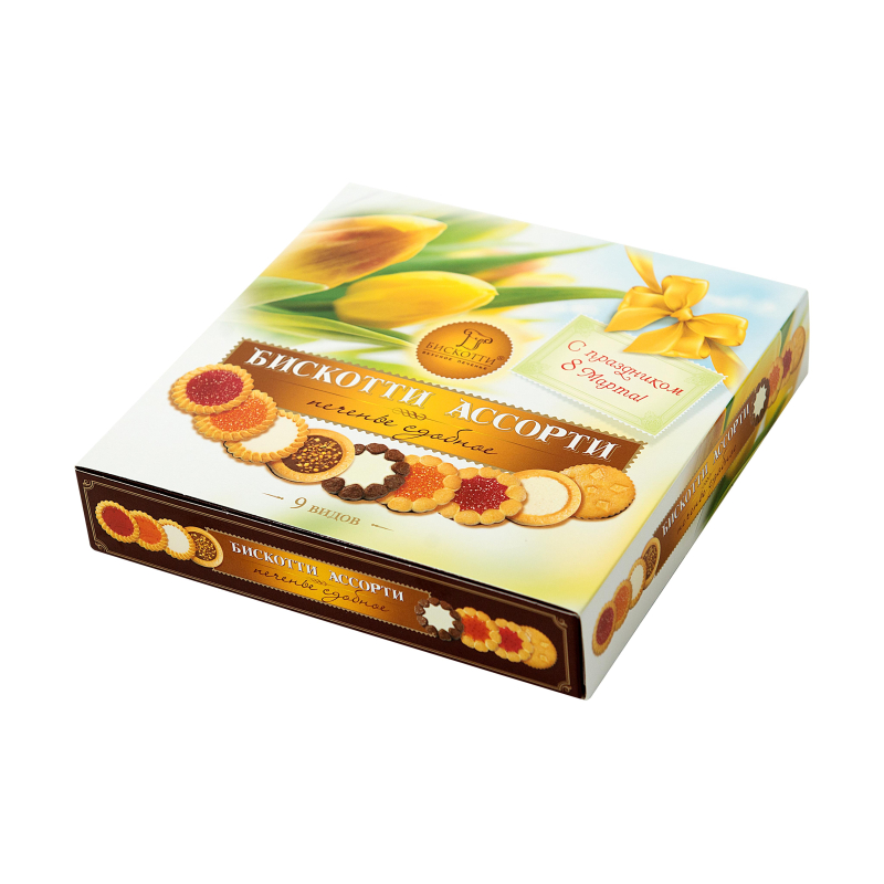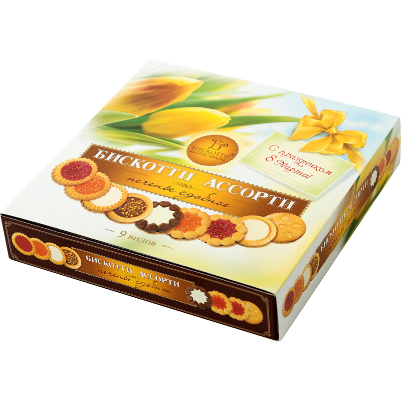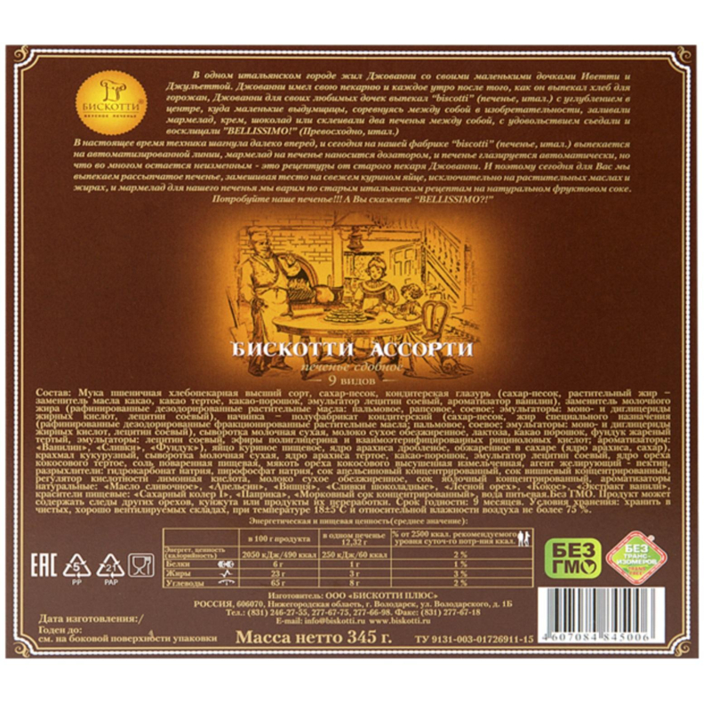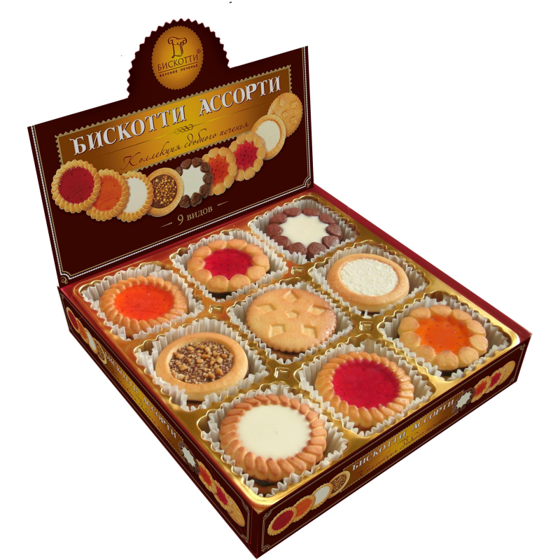 Сдобное печенье «Бискотти» ассорти — это замечательная подборка красиво оформленного, вкусного, высококачественного лакомства. Десертная коллекция в фирменной упаковке доставит радость и гастрономическое удовольствие, легко послужит великолепным презентом дорогому или уважаемому человеку. Ассорти включает 9 видов печенья, отражающих потребности многих сладкоежек и ценителей изысканных лакомств: <ul> <li>«Коста Браво апельсин» — тесто сдобное, начинка из цитрусового мармелада, тонкий слой нежной шоколадной глазури. Апельсиновый мармелад сварен на натуральном соке.</li> <li>«Бискотти с апельсиновым мармеладом» — гармоничный дуэт хрустящего печенья и цитрусовых оттенков начинки.</li> <li>«Коста Браво вишня» — сдобное тесто, приготовленный на натуральном соке вишневый мармелад, шоколадная глазурь.</li> <li>«Бискотти с вишневым мармеладом» — великолепный вариант для тех, кто в восторге от насыщенного вкуса вишни.</li> <li>«Бискотти с кремом» — рассыпчатая выпечка, нежный крем, шоколадная глазурь.</li> <li>«Бискотти шокко» — гармоничный союз печенья и шоколадной глазури.</li> <li>«Бискотти с орехом» — натертые ядра есть в тесте шоколадной начинке. Десерт декорирован дробленым фундуком в карамели и глазурью из шоколада.</li> <li>«Бискотти с кокосом» — красивое белоснежное лакомство, утонченное сочетание сдобного теста и кокосовой начинки. Тертое ядро кокоса есть в тесте и использовано для посыпки.</li> <li>«Бискотти ноттэ» — это контраст темного печенья и начинки из белого крема, деликатно подчеркнутый шоколадной глазурью.</li> </ul> Пробуйте печенье «Бискотти Ассорти» — выбирайте самый вкусный вариант либо наслаждайтесь изысканным разнообразием великолепных начинок. Состав: мука пшеничная хлебопекарная в/с, сахарная пудра, кондитерская глазурь (сахар-песок, растительный жир — заменитель какао-масла, какао тертое, какао-порошок, эмульгатор лецитин соевый, ароматизатор ванилин), растительный жир (фракции пальмового масла, антиокислитель лимонная кислота), начинка — кондитерская масса молочная (сахар-песок, жир кондитерский (смесь пальмового и подсолнечного масел, антиокислитель аскорбиновая кислота), сухое обезжиренное молоко, эмульгатор лецитин соевый), яйцо куриное пищевое, начинка — кондитерская масса ореховая (сахар-песок, жир кондитерский (смесь пальмового и подсолнечного масел, антиокислитель аскорбиновая кислота), какао-порошок, эмульгатор лецитин соевый, ароматизаторы: «Лесной орех», «Шоколад»), ядро арахиса дробленое, обжаренное в сахаре, крахмал кукурузный, сыворотка сухая молочная, ядро арахиса тертое, какао-порошок, эмульгатор лецитин соевый, ядро ореха кокосового тертое, соль поваренная пищевая, мякоть ореха кокосового высушенная измельченная, агент желирующий — пектин, разрыхлители: гидрокарбонат натрия, пирофосфат натрия, сок апельсиновый концентрированный, сок вишневый концентрированный, антиокислитель лимонная кислота, сухое обезжиренное молоко, сок яблочный концентрированный, ароматизаторы натуральные: «Масло», «Апельсин», «Вишня», «Сливки шоколадные», «Лесной орех», «Кокос», ароматизатор ванилин, красители пищевые: «Сахарный колер IV», «Аннато», «Морковный сок концентрированный», вода питьевая. Страна производства: Россия. Упаковка: картонная. Масса нетто: 345 г. Пищевая ценность на 100 г кондитерского изделия: белки 