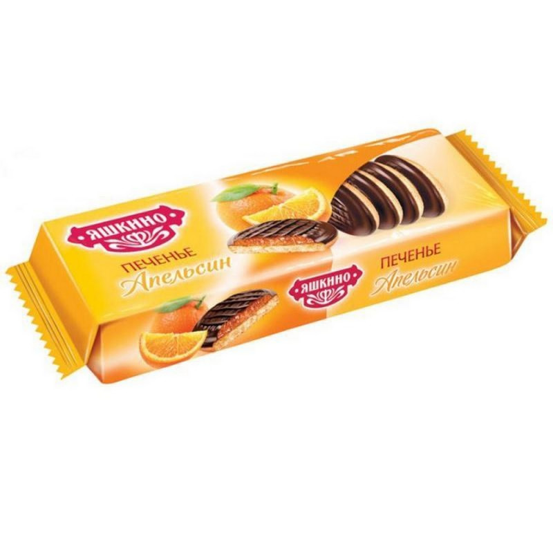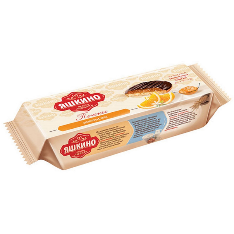 Печенье сдобное Яшкино. Апельсин - это сдобное, воздушное бисквитное печенье, покрытое слоем джема и глазури. Апельсиновый джем не содержит искусственных красителей и ароматизаторов. Состав: патока крахмальная, сахар песок, вода питьевая, кондитерская глазурь (сахар, эквивалент масла какао (фракции масел растительных (средняя фракция пальмового масла, стеарин ши), масло иллипе, антиокислитель концентрат смеси токоферолов (Е306), регулятор кислотности - лимонная кислота (Е330)), какао порошок, какао тертое, эмульгатор: лецитин соевый (Е322), эмульгатор (Е476), ароматизатор Ванилин, мука пшеничная хлебопекарная высшего сорта, продукты яичные сухие: меланж, крахмал кукурузный, масло подсолнечное рафинированное дезодорированное, желирующий агент: пектин, эмульгатор: крем-паста для взбивания (эмульгаторы (Е471), (Е475), влагоудерживающий агент пропиленгликоль (Е1520), сахар, консервант сорбат калия (Е202), загуститель: глицерин, влагоудерживающий агент: сорбитовый сироп, концентрированный сок апельсина, разрыхлители - карбонаты аммония (карбонат аммония, гидрокарбонат аммония), гидрокарбонат натрия, ароматизатор пищевой апельсин, соль поваренная пищевая, краситель натуральный: Каротин. Пищевая ценность в 100 г продукта: белки - 3,5 г, жиры - 4,5 г, углеводы - 60 г. Энергетическая ценность в 100 г продукта: 294 ккал/ 1245 кДж. Срок годности: 6 месяцев. Условия хранения: при температуре от 13 до 23 °С и относитльной влажности воздуха не более 75%. Масса нетто: 137 г. Тип упаковки: мягкая. Страна производства: Россия.