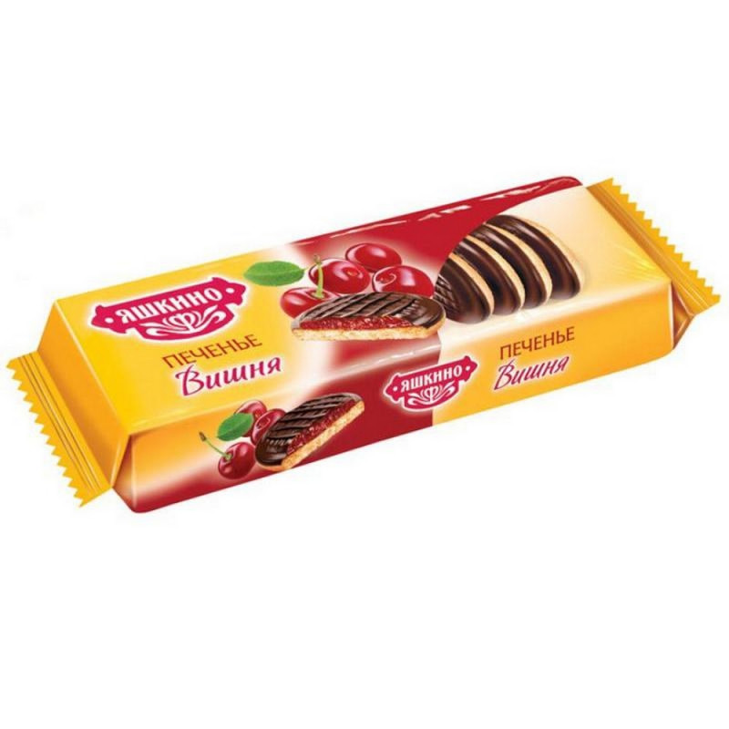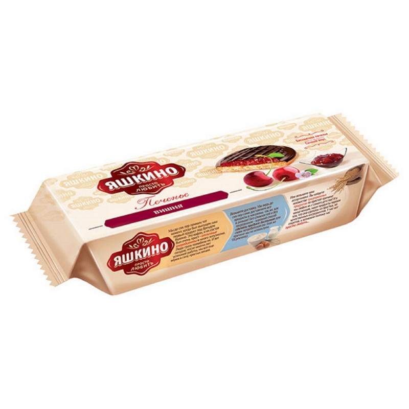 Печенье сдобное Яшкино. Вишня - это воздушное бисквитное печенье, покрытое слоем джема и глазури. Вишневый джем не содержит искусственных красителей и ароматизаторов. Состав: патока крахмальная, сахар, мука пшеничная хлебопекарная в/с (содержит глютен), глазурь кондитерская (сахар, эквивалент масла какао, эмульгатор: подсолнечный лецитин (Е322)); какао-порошок, какао тертое, эмульгатор: лецитин соевый, Е476; ароматизатор: ванилин); яйцо куриное, крахмал кукурузный, продукты яичные сухие: меланж; масло подсолнечное рафинированное дезодорированное; загуститель: глицерин; крем-паста для взбивания (вода, сахар, эмульгаторы: Е471, Е475; агент влагоудерживающий: пропиленгликоль, консервант: сорбат калия); желирующий агент: пектин; агент влагоудерживающий: сорбитовый сироп; регулятор кислотности: лимонная кислота; ароматизатор пищевой вишня; краситель натуральный: концентрированный сок черной моркови (сок черной моркови, регулятор кислотности - лимонная кислота); концентрированный сок вишни, соль, разрыхлители: карбонаты аммония, гидрокарбонат натрия. Пищевая ценность на 100 г продукта: белки - 4 г, жиры - 9,2 г, углеводы - 70,8 г. Энергетическая ценность в 100 г продукта: 360 ккал. Срок годности: 6 месяцев. Условия хранения: при температуре от 13 до 23 °С и относитльной влажности воздуха не более 75%. Масса нетто: 137 г. Тип упаковки: мягкая. Страна производства: Россия.